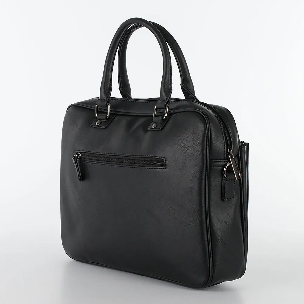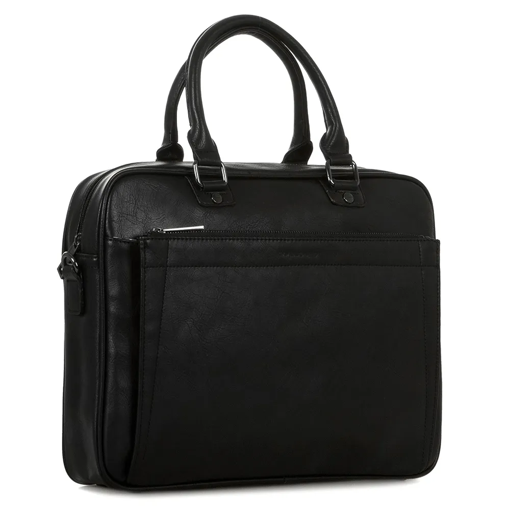 Стильная деловая сумка от бренда David Jones выполнена из искусственной кожи черного цвета с эффектом «пулл-ап». Модель прямоугольной закругленной формы, с двумя короткими ручками на кольцах-держателях, со съемным регулируемым плечевым ремнем. Отделение на молнии, с текстильной подкладкой. Внутри: отделение под ноутбук на липучке, два накладных кармана. На передней стороне – накладной карман на молнии, на задней – карман на молнии.