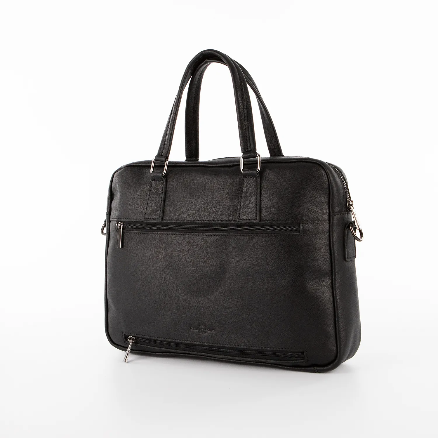 Сумка от торговой марки Poshete из натуральной кожи черного цвета. Модель с двумя ручками и съемным плечевым ремнем. Отделение на молнии. Внутри: фирменная подкладка, накладной карман с уплотненной стенкой для ноутбука, карман на молнии. На задней стороне – карман на молнии, который также можно использовать в качестве лямки для крепления на выдвижную ручку чемодана, расстегнув нижнюю молнию.