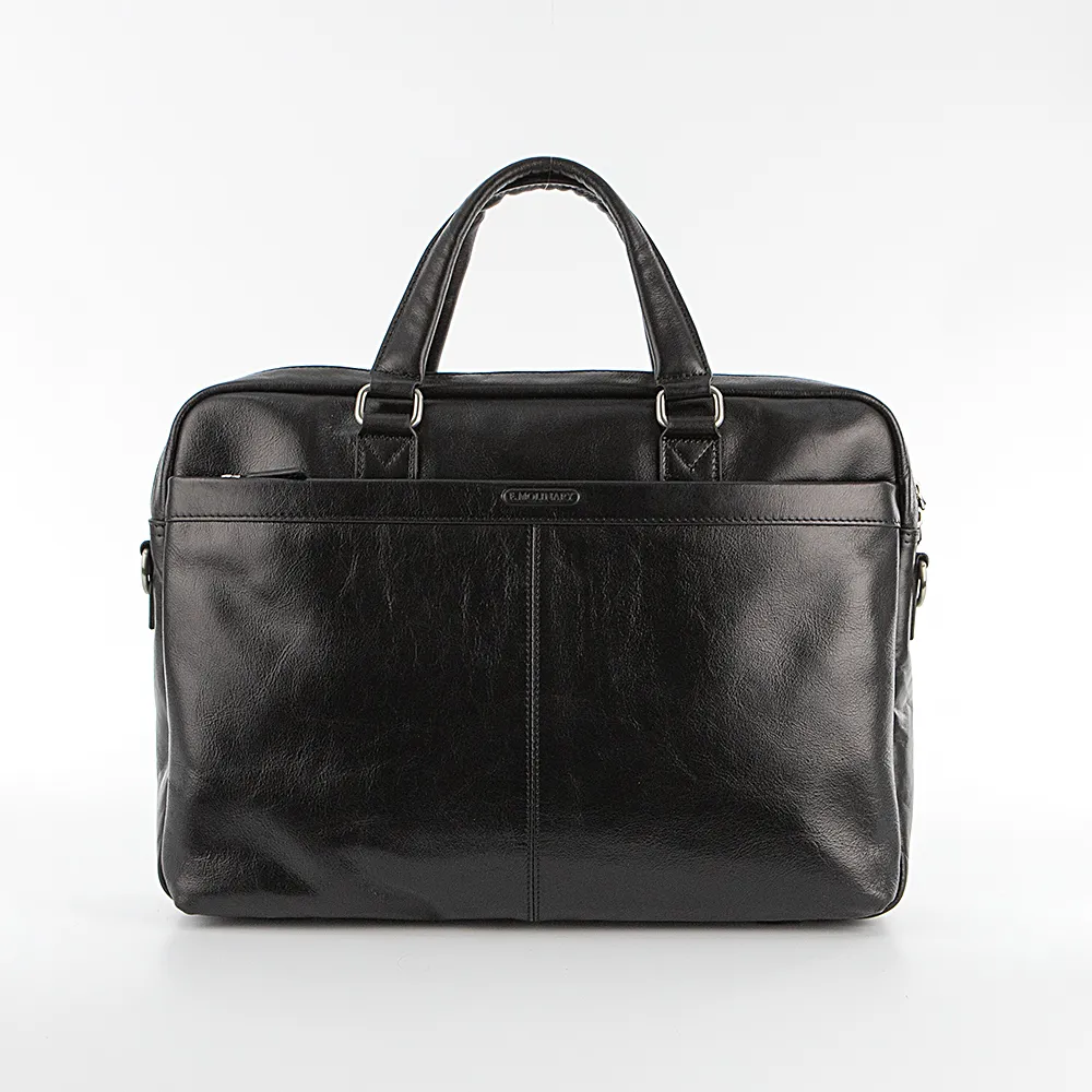 Мужская сумка от торговой марки Francesco Molinary из натуральной кожи черного цвета. Вместительная модель с двумя ручками и широким съемным регулируемым плечевым ремнем, выполненным из текстильного материала. Два отделения на молнии, с фирменной подкладкой. В основном отделении – два накладных кармана, карман на молнии. В заднем отделении – два накладных кармана. На лицевой и задней сторонах – карман на молнии; в заднем кармане имеется лямка для крепления на выдвижную ручку чемодана. На дне имеются нашивки для защиты от износа.