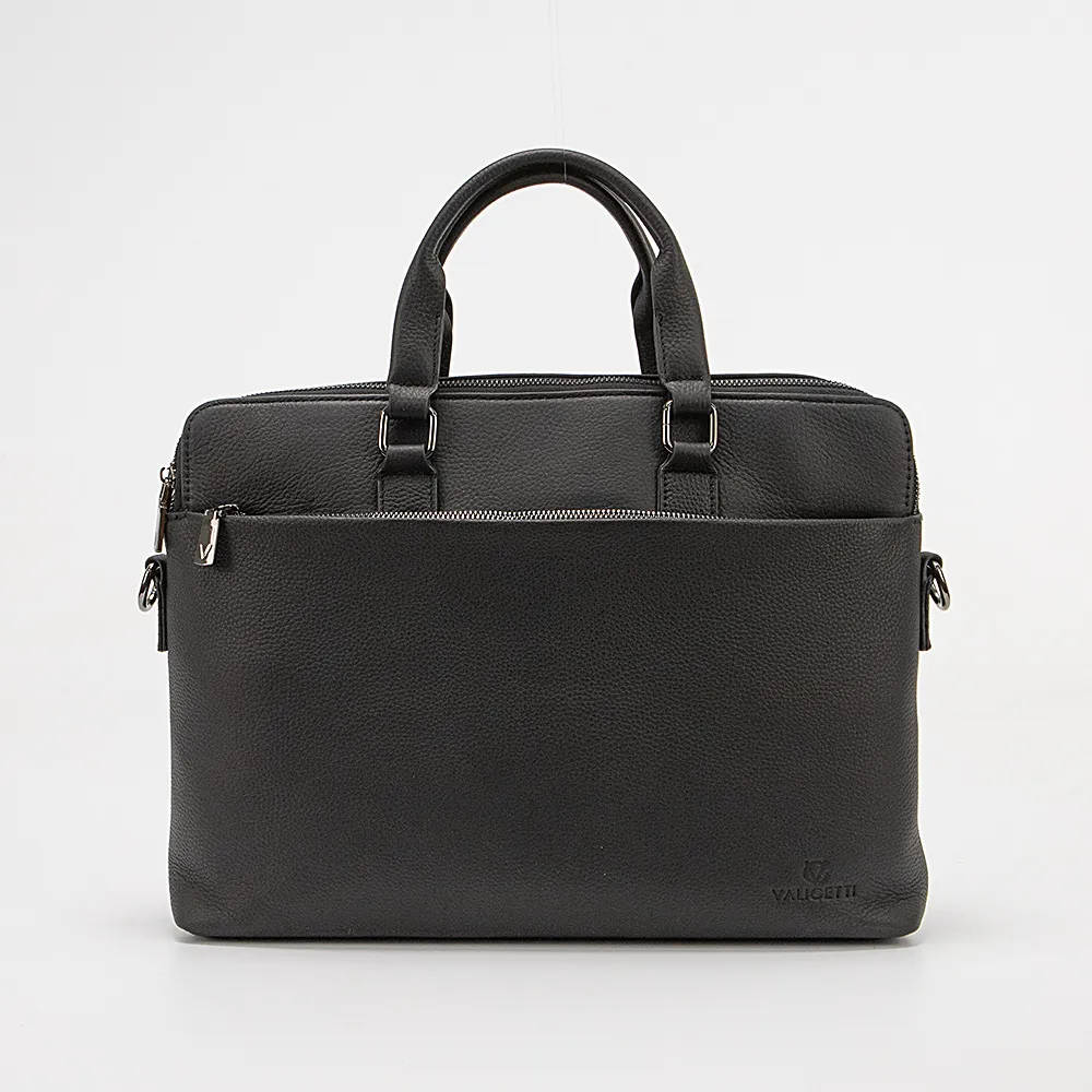 Деловая сумка от торговой марки Valigetti из натуральной кожи черного цвета. Модель с двумя ручками и съемным регулируемым плечевым ремнем, выполненным из текстильного материала. Два отделения на молнии, с текстильной подкладкой. В заднем отделении – карман на молнии. В переднем – накладной карман. На лицевой и задней сторонах – вместительные карманы на молнии.