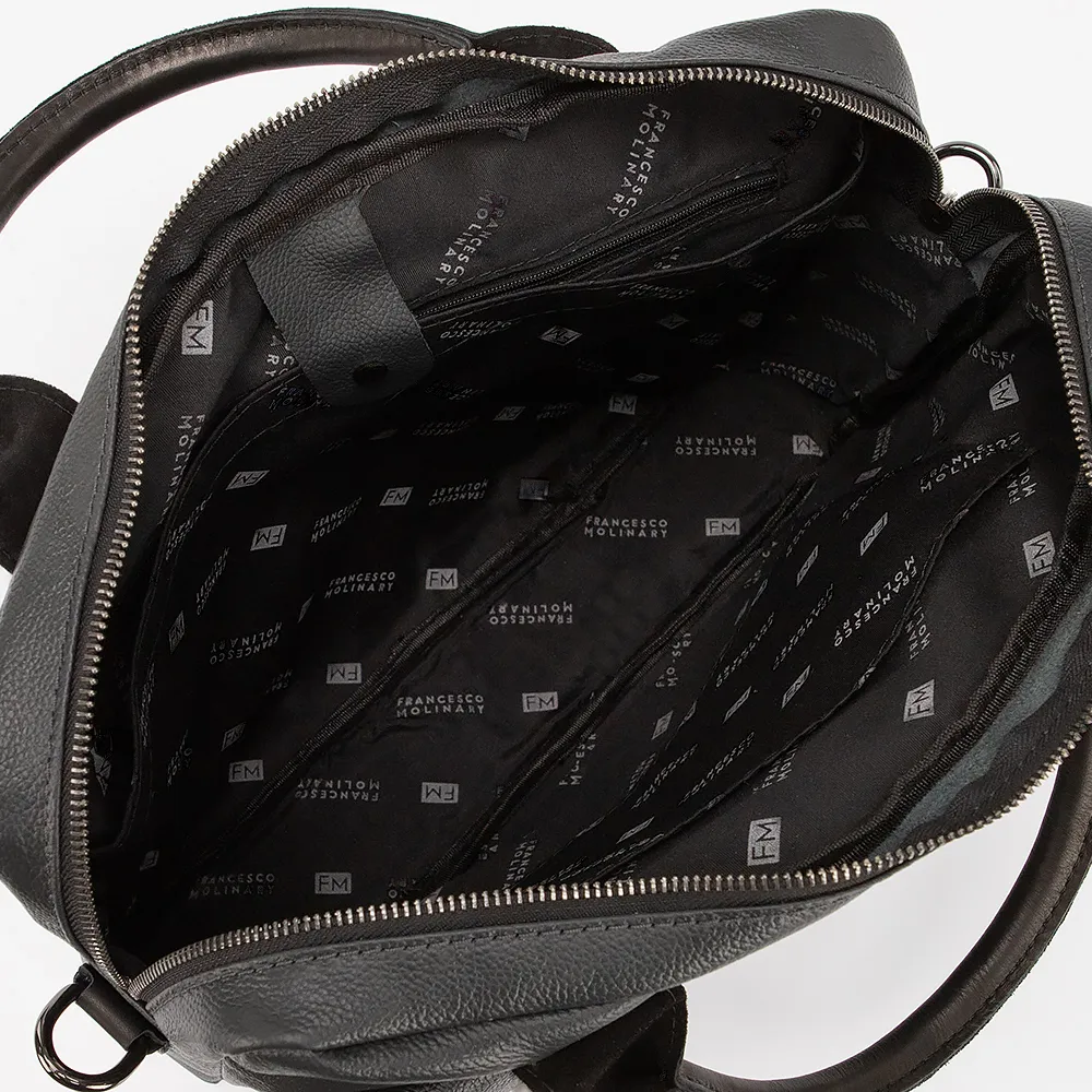 Сумка от торговой марки Francesco Molinary из натуральной кожи черного цвета. Модель с двумя ручками и съемным регулируемым плечевым ремнем. Отеление на молнии, внутри фирменная подкладка, накладной карман, карман на молнии и отделение для ноутбука с хлястиком на кнопке. На лицевой стороне два накладных кармана на магнитной кнопке. На задней стороне - карман на молнии, который можно использовать как лямку для крепления на ручку чемодана.