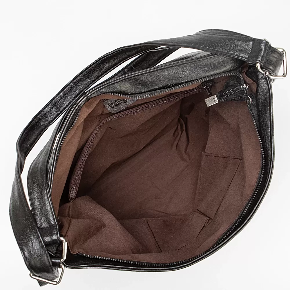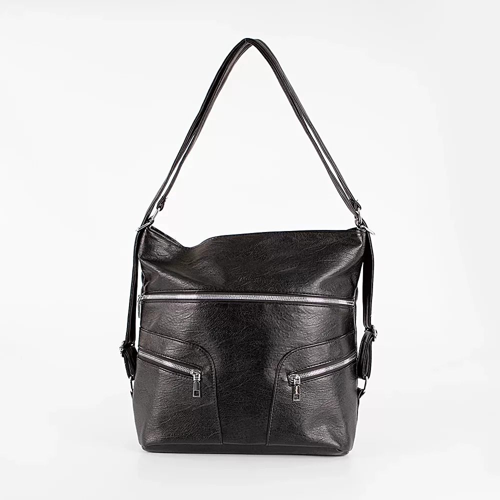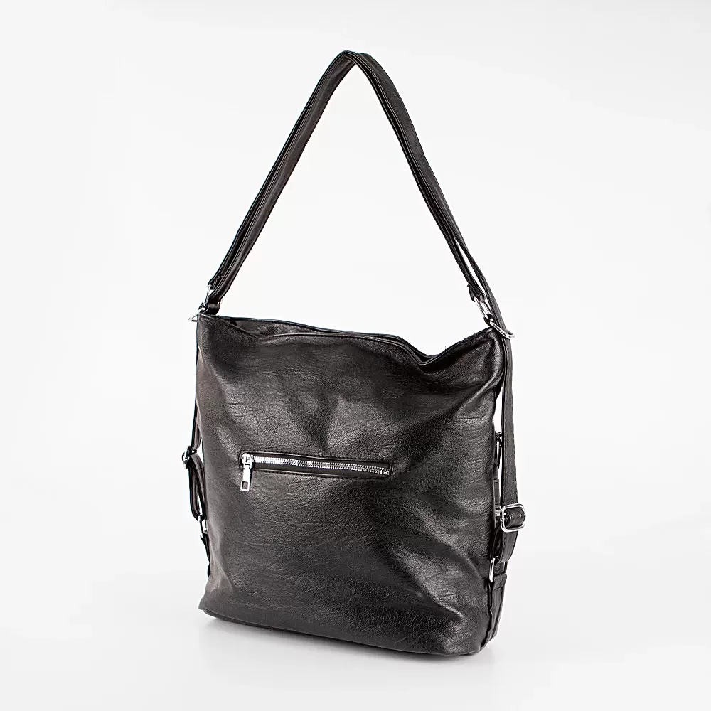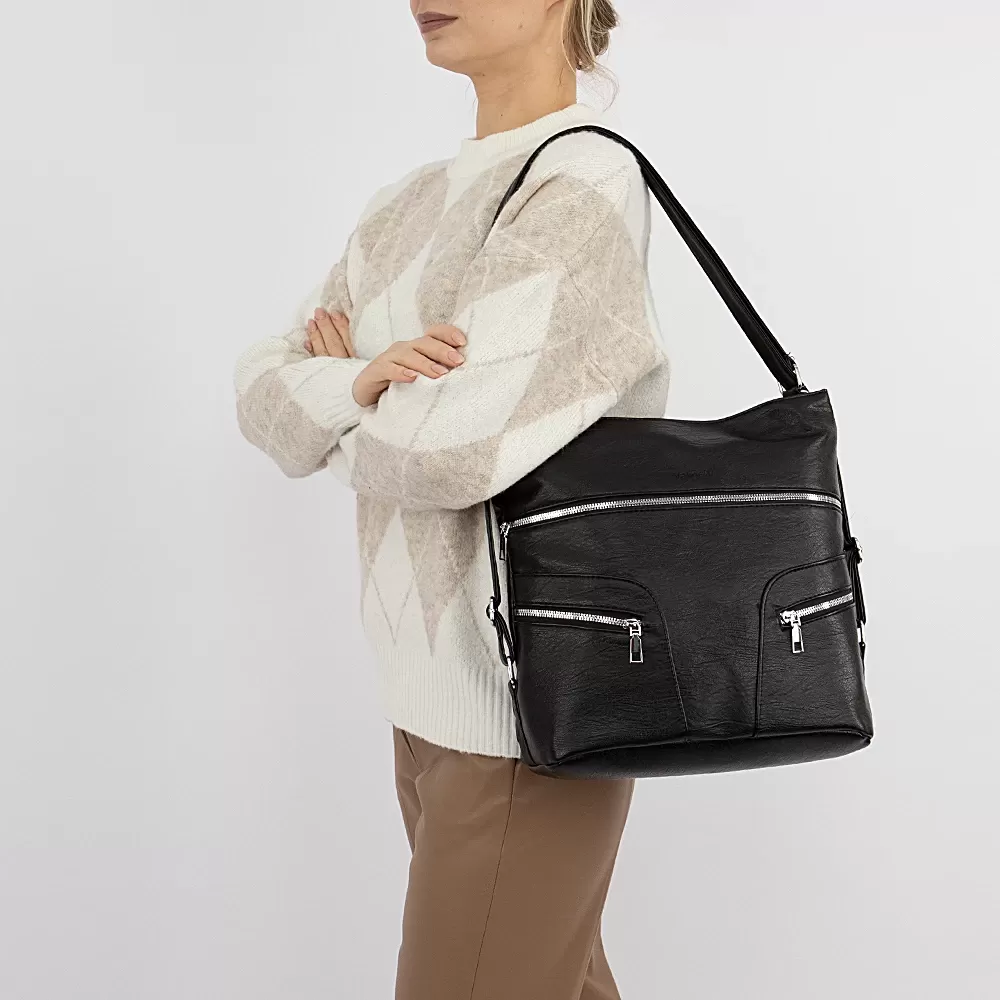 Сумка-рюкзак от бренда Valigetti выполнена из искусственной кожи черного цвета. Модель оснащена двумя ручками, которые при необходимости можно легко трансформировать в удобные плечевые лямки.