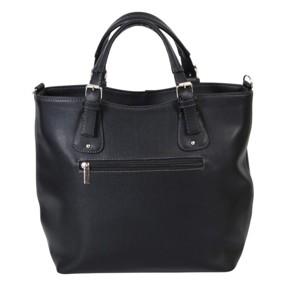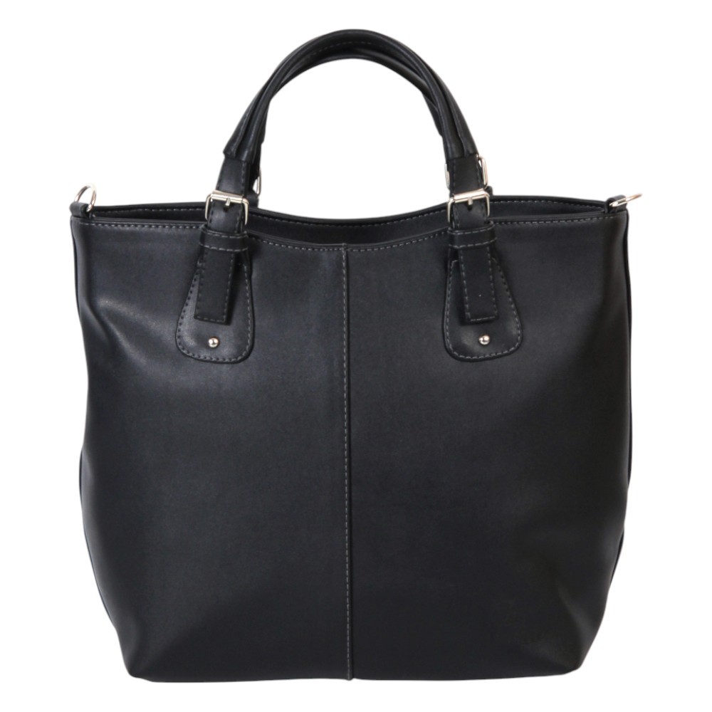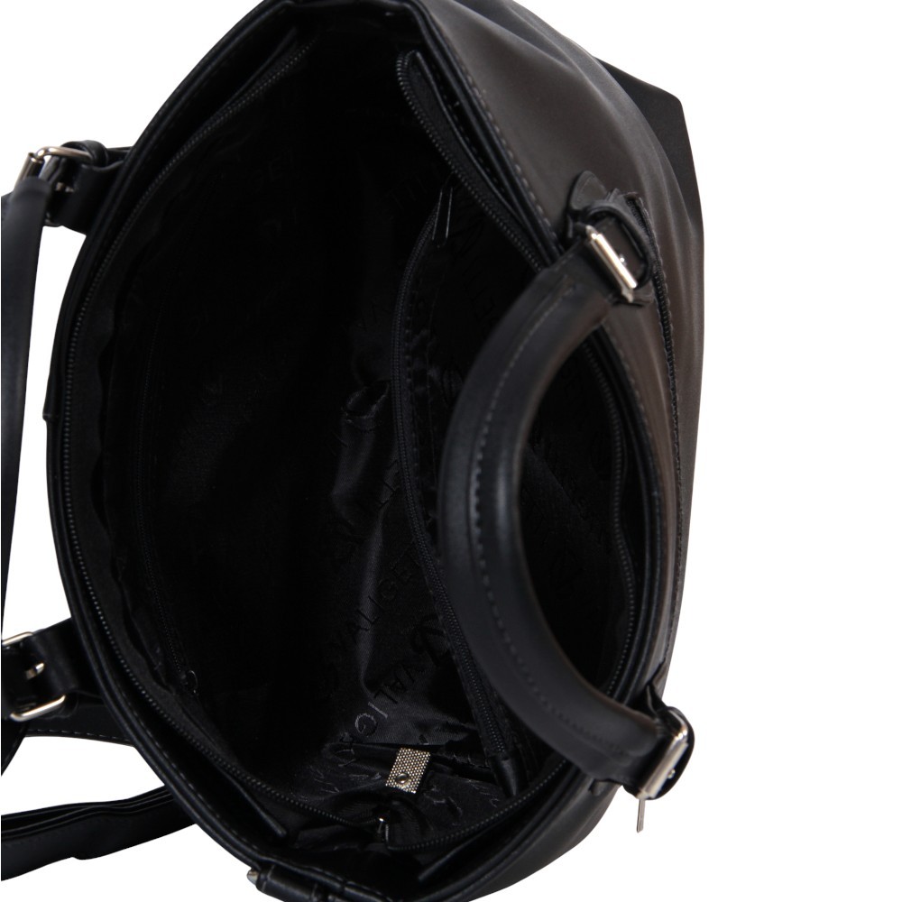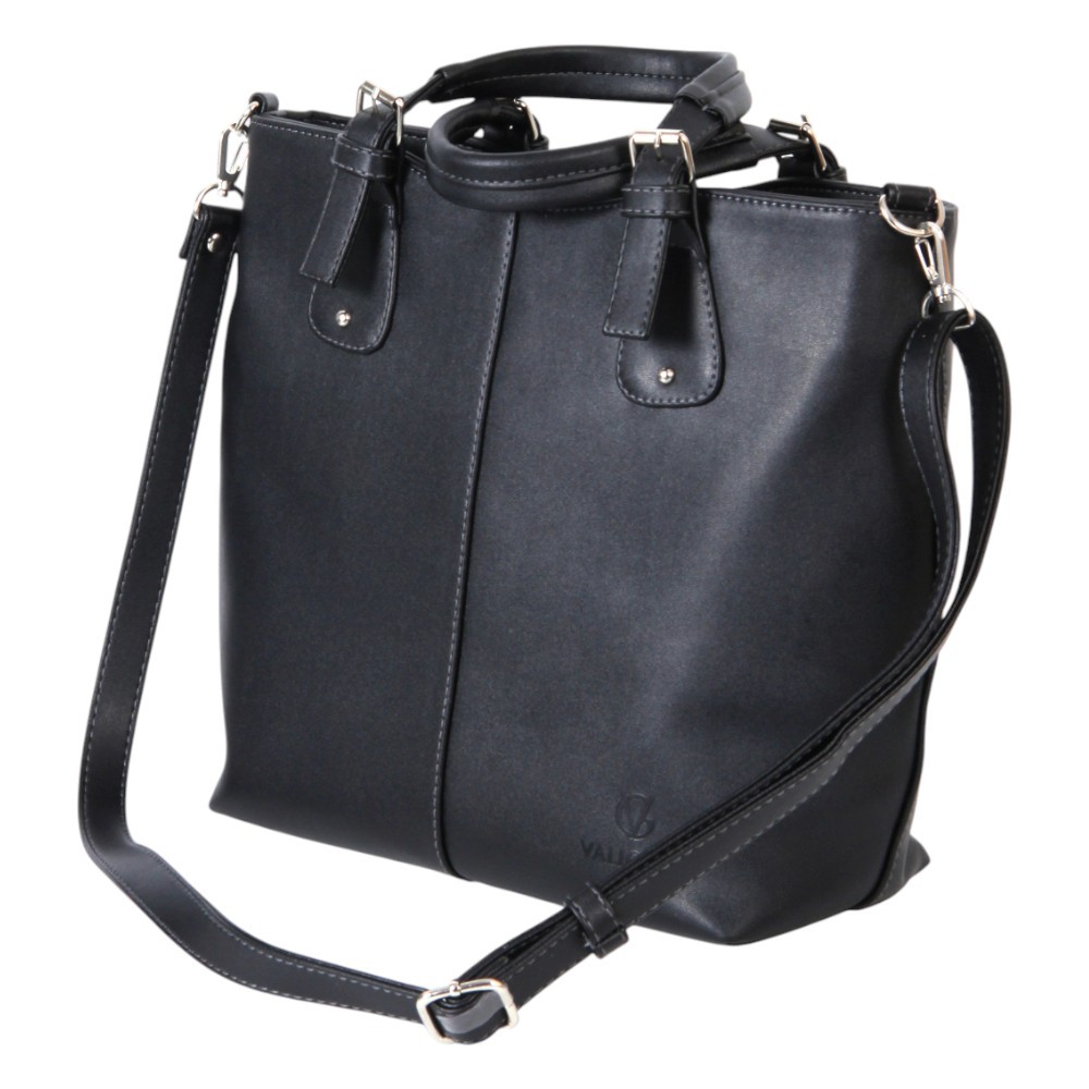 Сумка от бренда Valigetti из искусственной кожи выполнена в черном цвете. Модель с двумя ручками и съемным регулируемым плечевым ремнем. Основное отделение на молнии, внутри: фирменная текстильная подкладка, накладной открытый карман и два кармана на молнии. На задней стороне сумки расположен горизонтальный карман быстрого доступа на молнии. Дно оснащено металлическими ножками для защиты от износа.