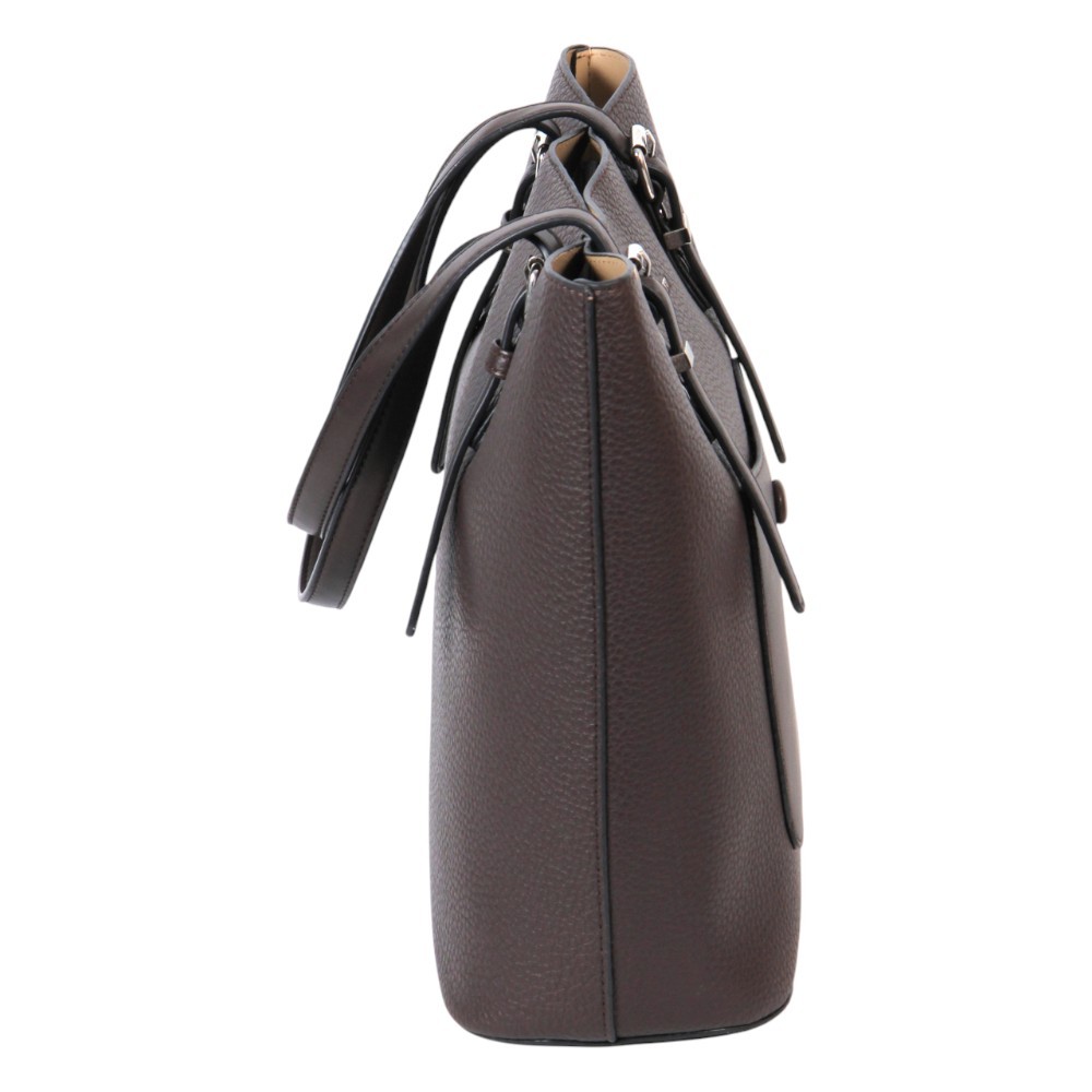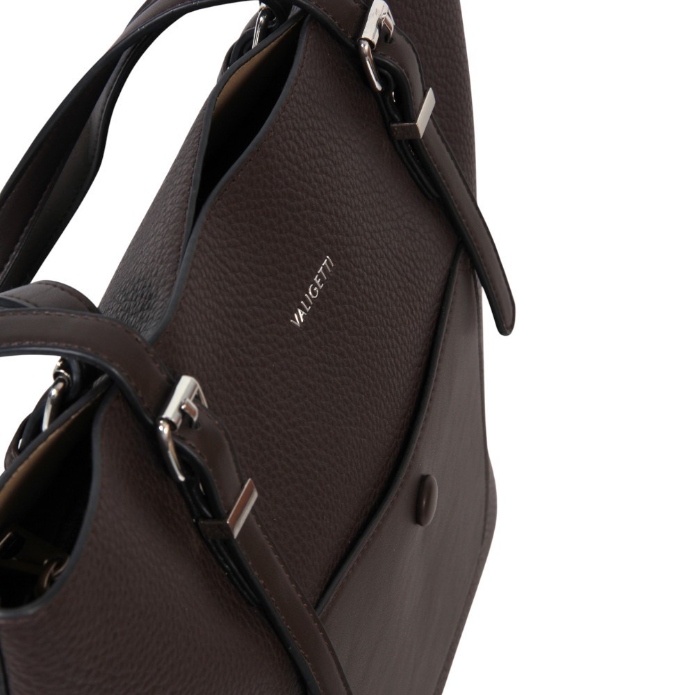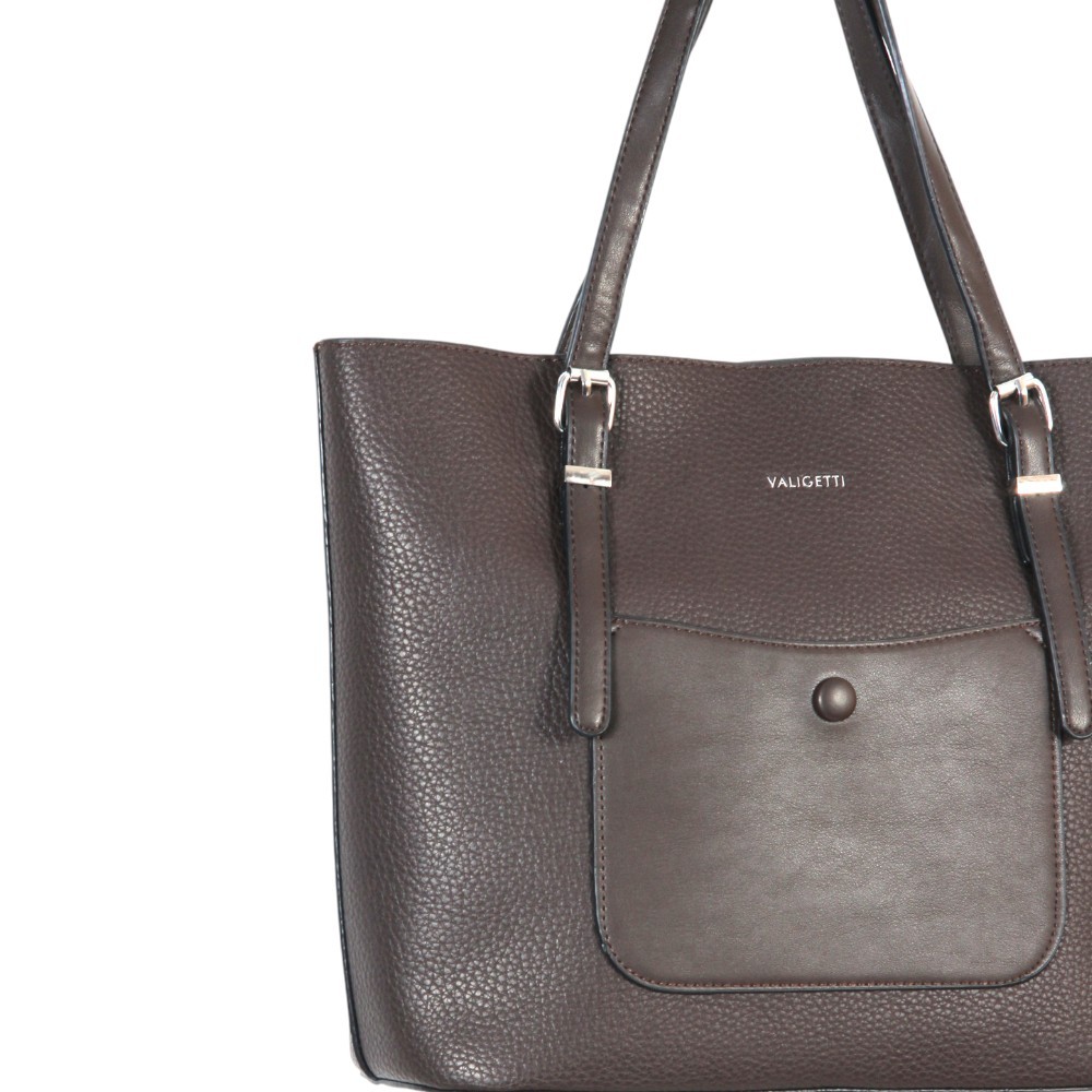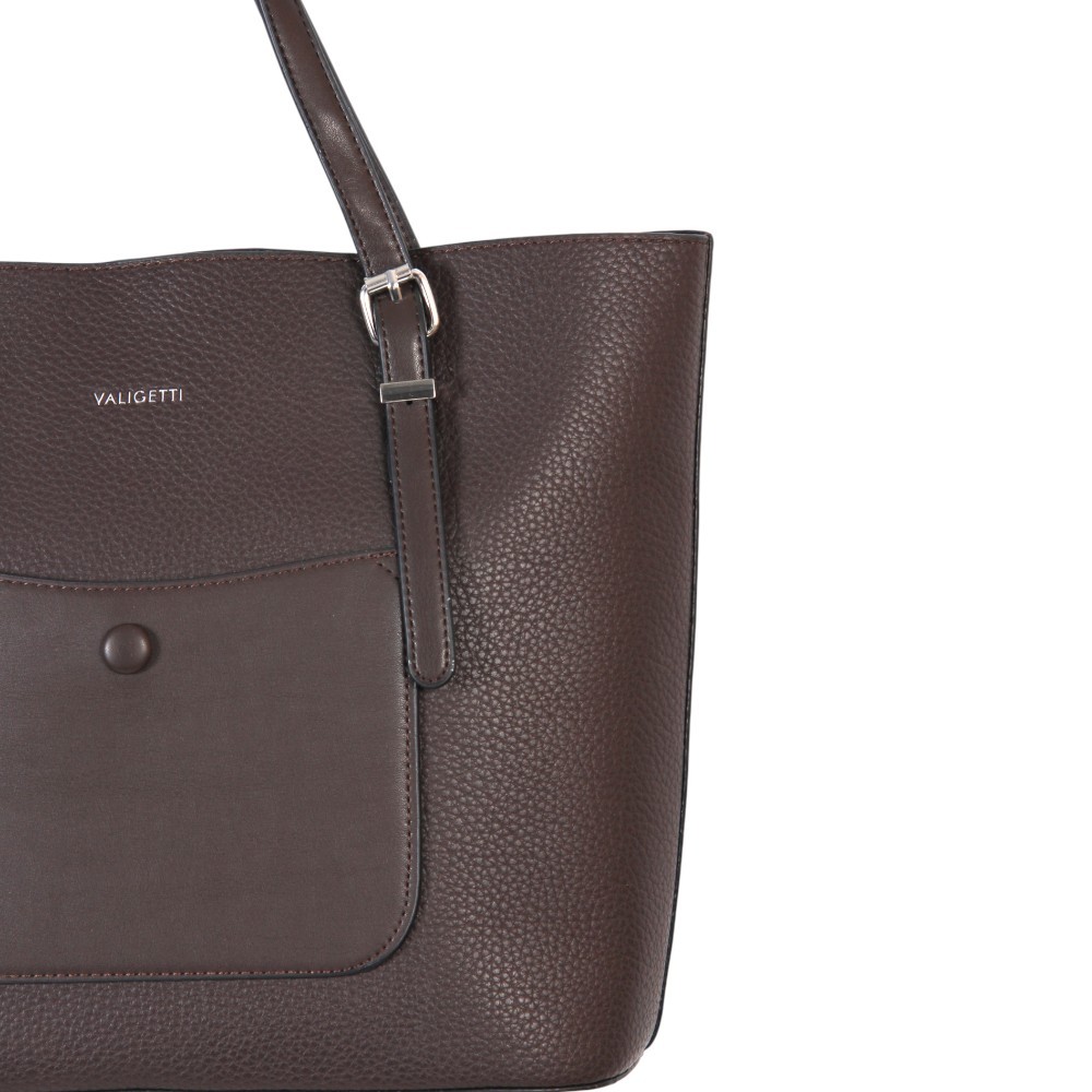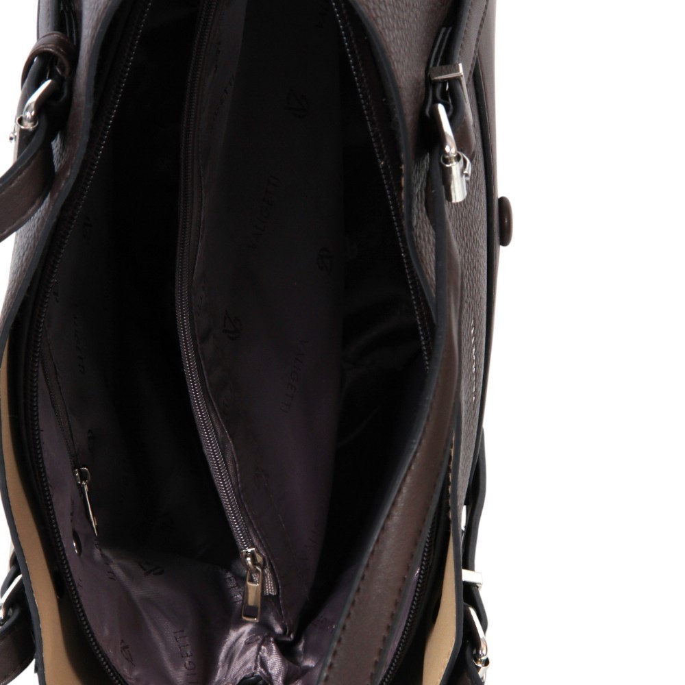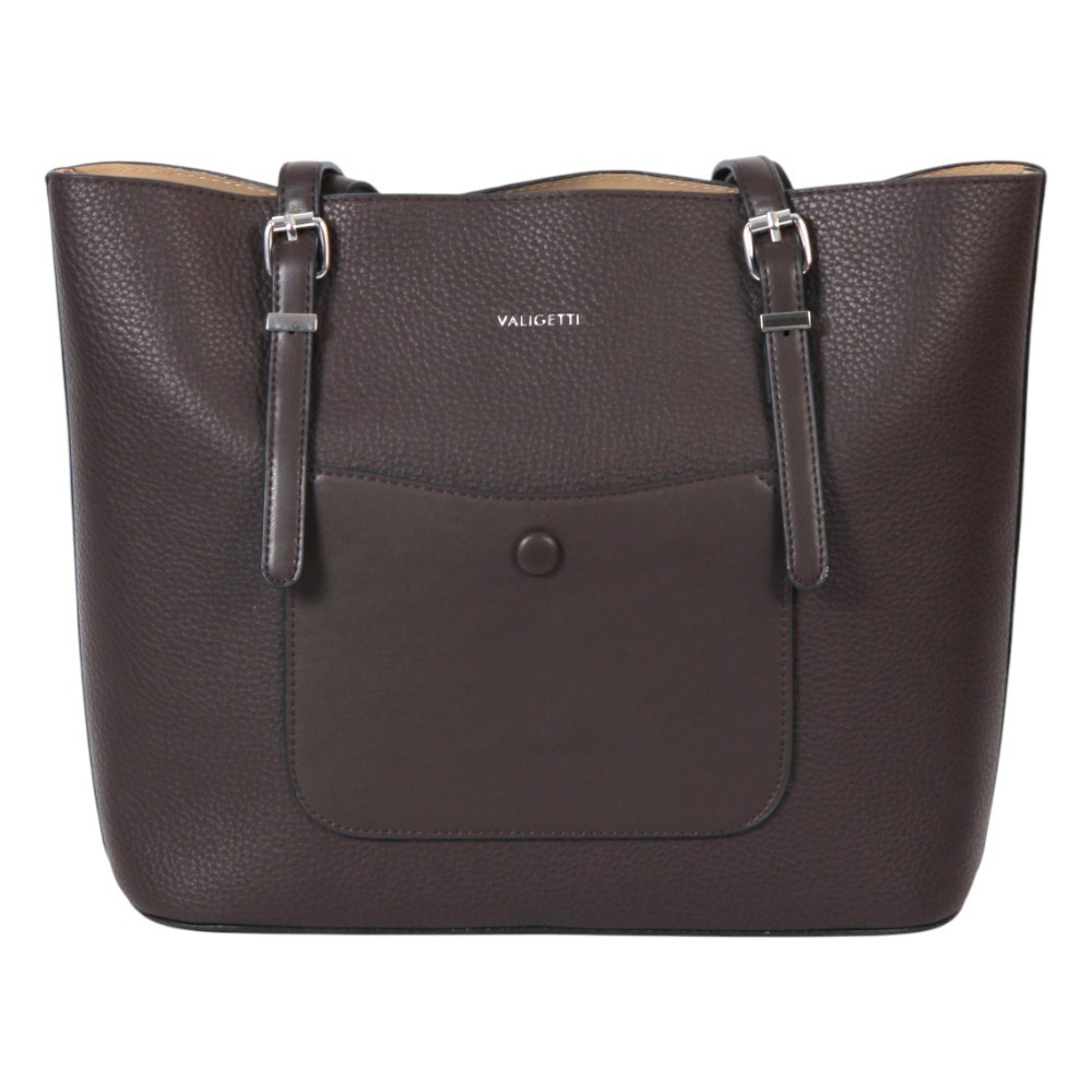 Сумка от бренда Valigetti из искусственной кожи коричневого цвета. Модель с двумя регулируемыми удлиненными ручками. В отделении – средник на молнии с перегородкой и карманом на молнии. На лицевой стороне – карман на магнитной кнопке.