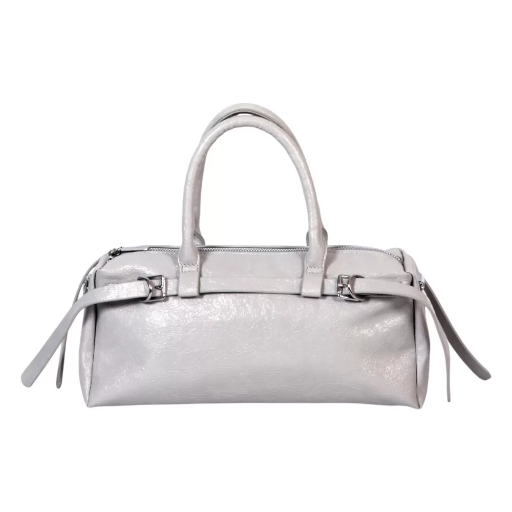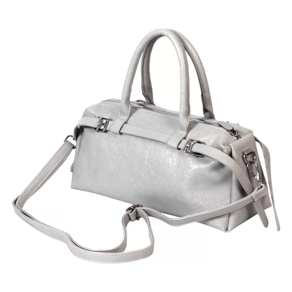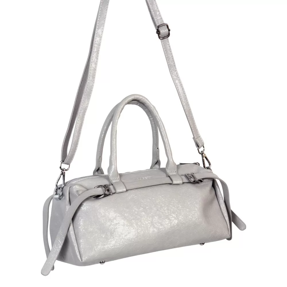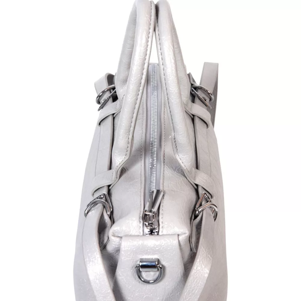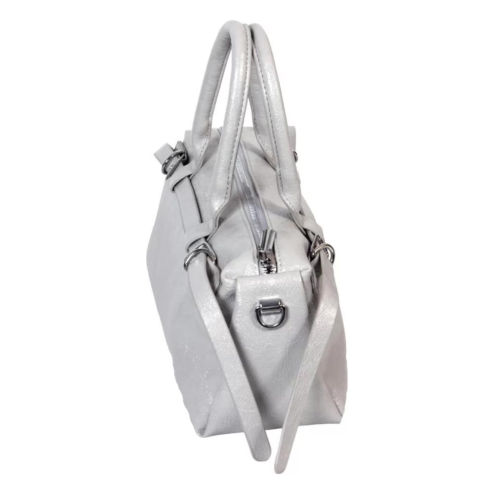 Сумка от бренда Valigetti выполнена из искусственной кожи в сером цвете. Модель с двумя ручками и съемным регулируемым плечевым ремнем. Основное отделение на молнии, внутри текстильная подкладка, накладной карман на молнии и открытый накладной карман. Дно оснащено металлическими ножками для защиты от износа.