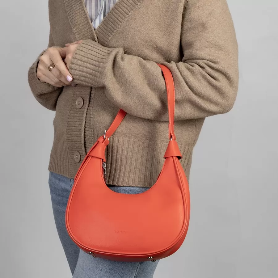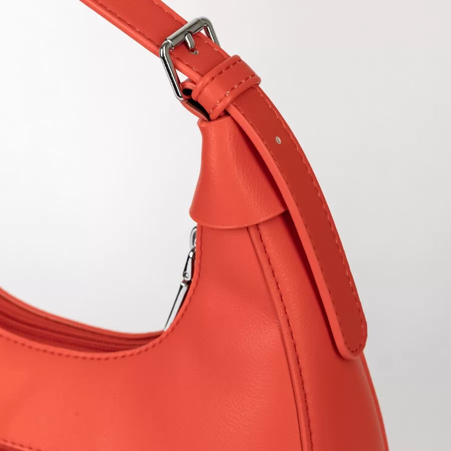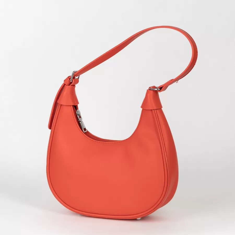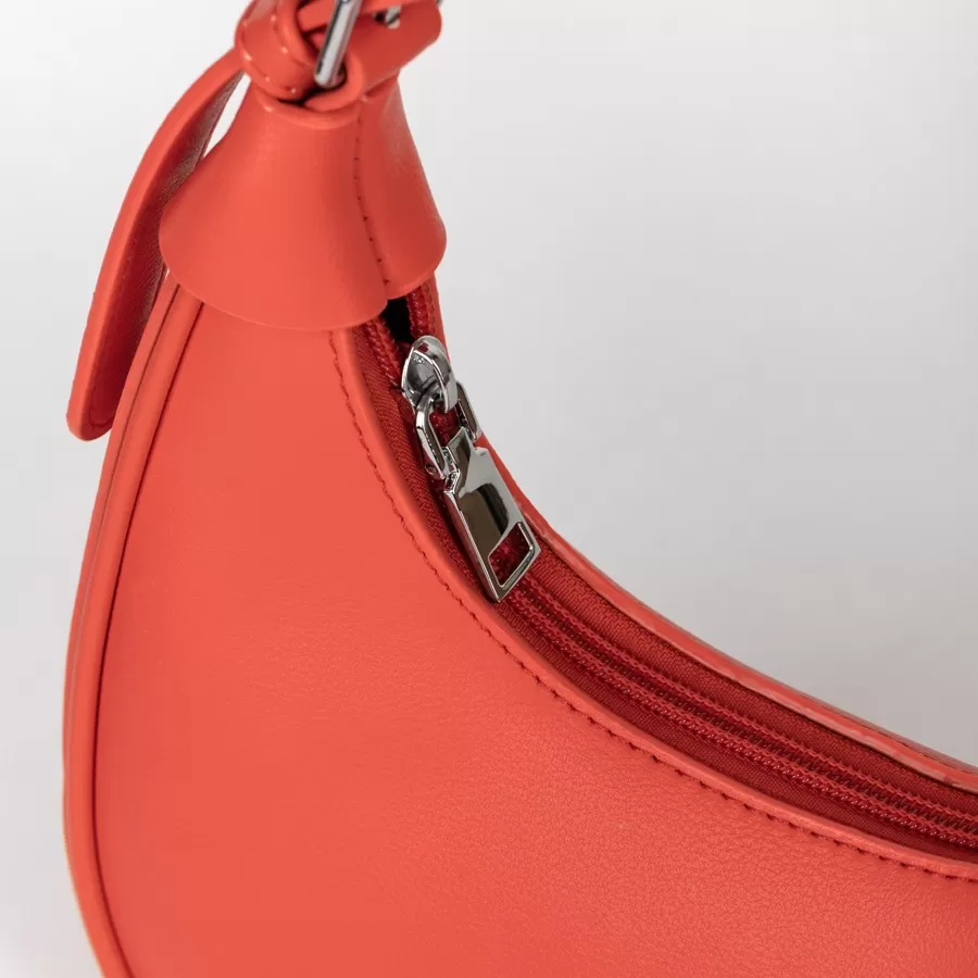Яркая женская сумка бренда Valigetti из искусственной кожи алого цвета с зернистой структурой. Есть ножки для установки на твердую поверхность. Имеет пришитые кожаные ручки. Внутри 2 отделения под молнией, средник на молнии, карман на молнии и кармашек для мелких вещей. На задней стороны есть карман на молнии. В комплект входит съемный плечевой ремень