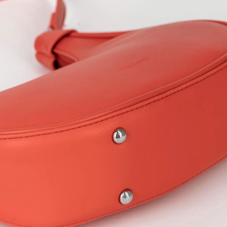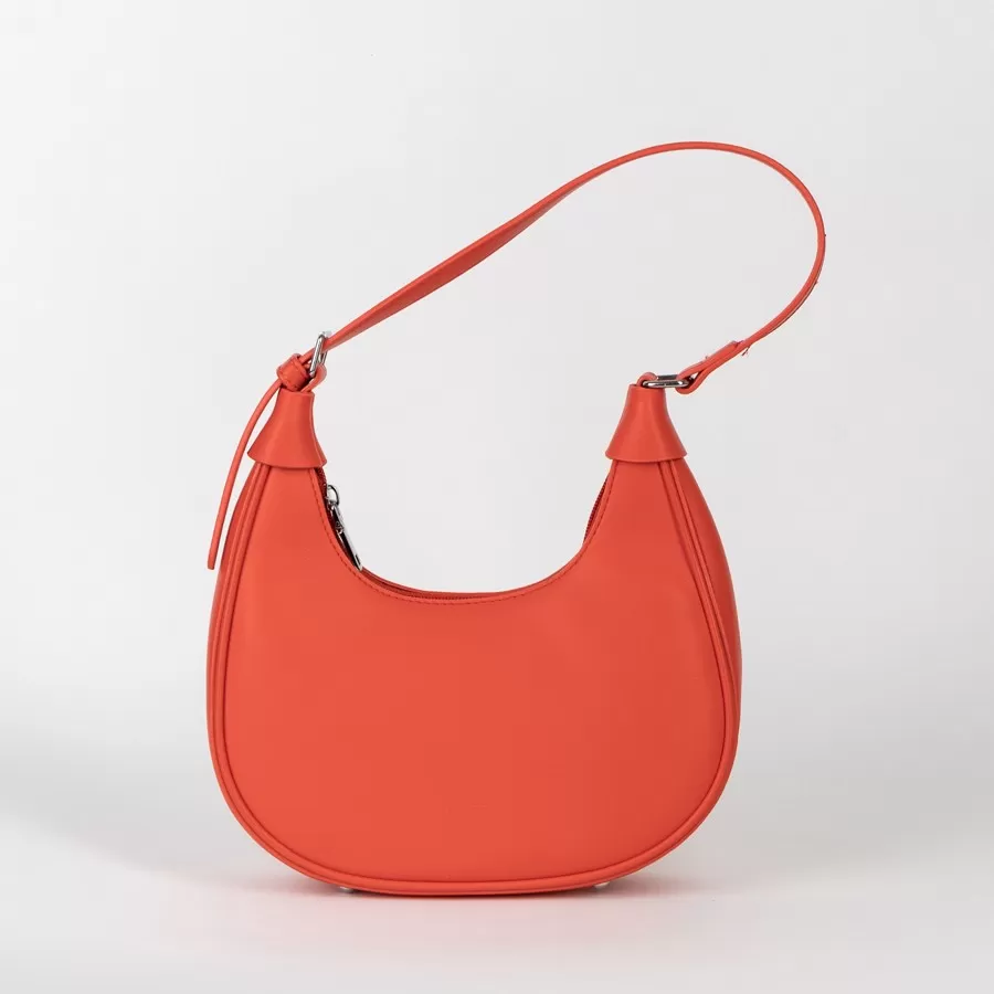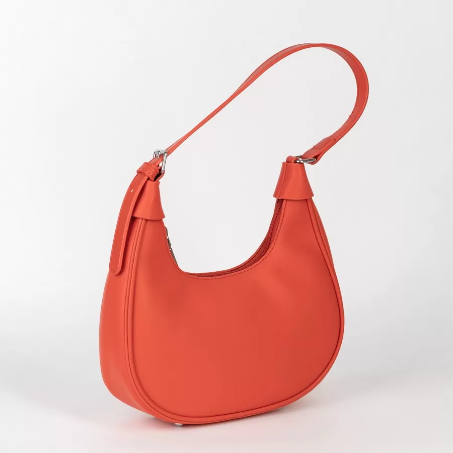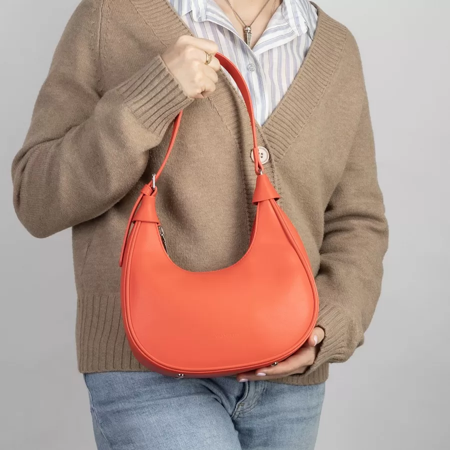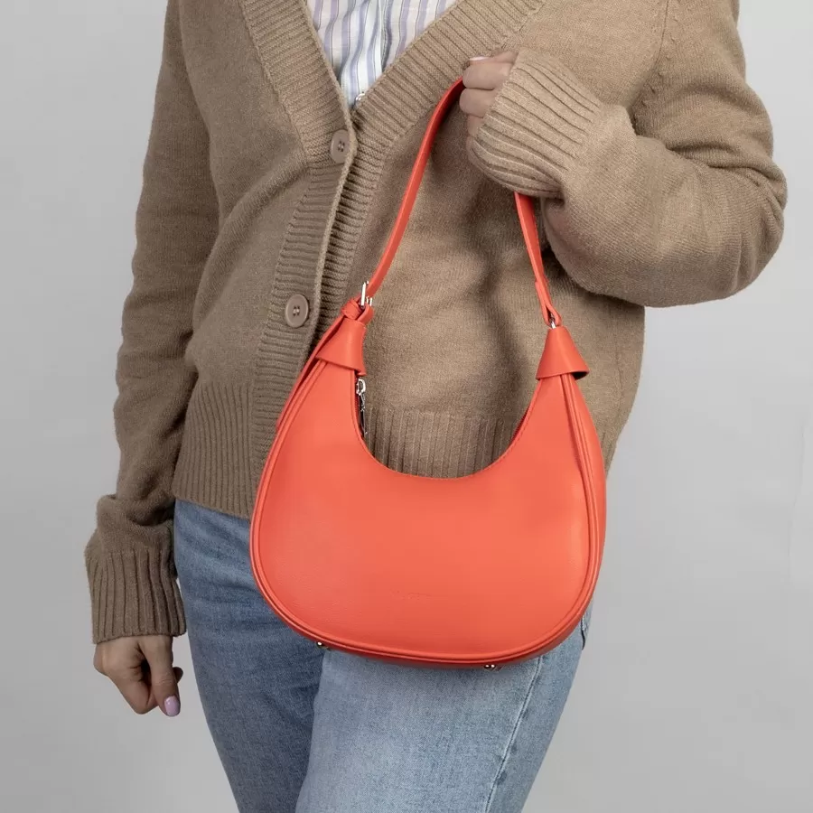 Яркая женская сумка бренда Valigetti из искусственной кожи алого цвета с зернистой структурой. Есть ножки для установки на твердую поверхность. Имеет пришитые кожаные ручки. Внутри 2 отделения под молнией, средник на молнии, карман на молнии и кармашек для мелких вещей. На задней стороны есть карман на молнии. В комплект входит съемный плечевой ремень