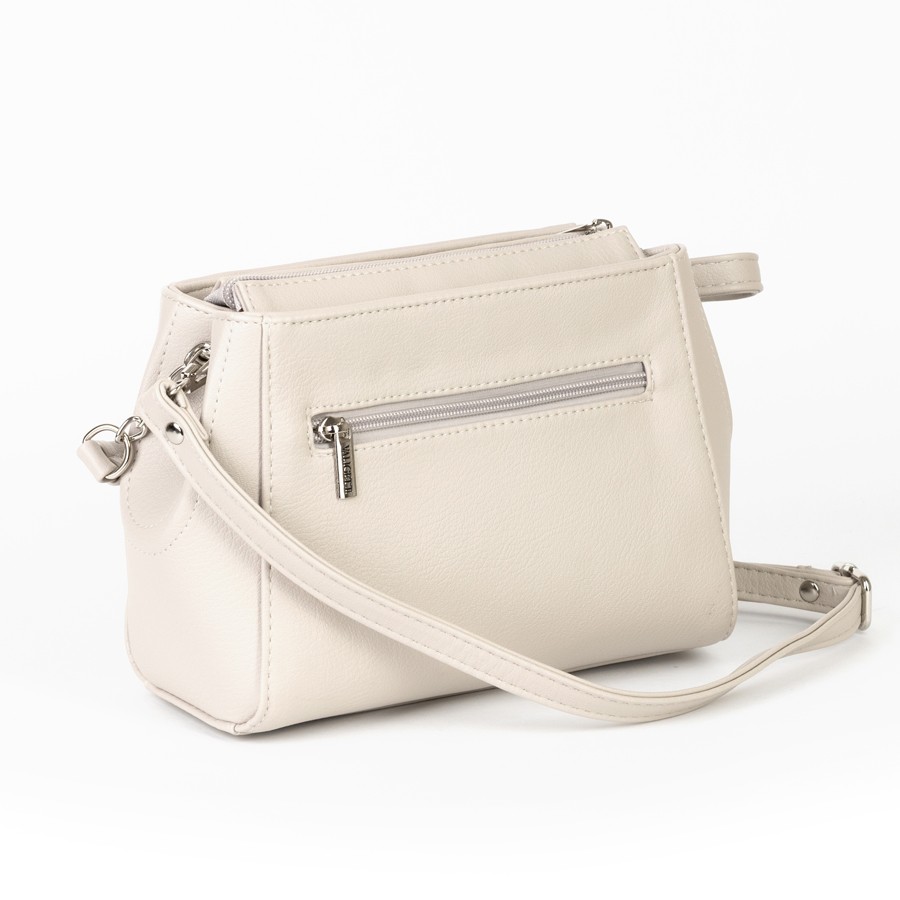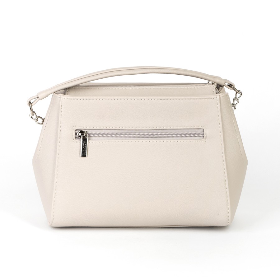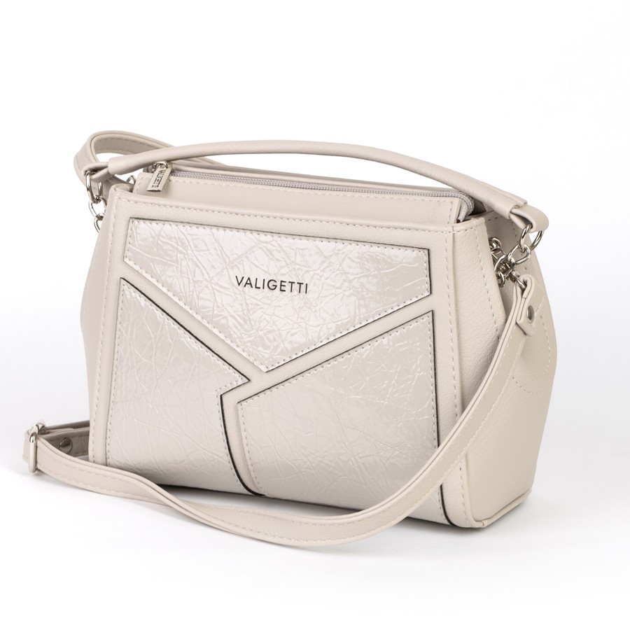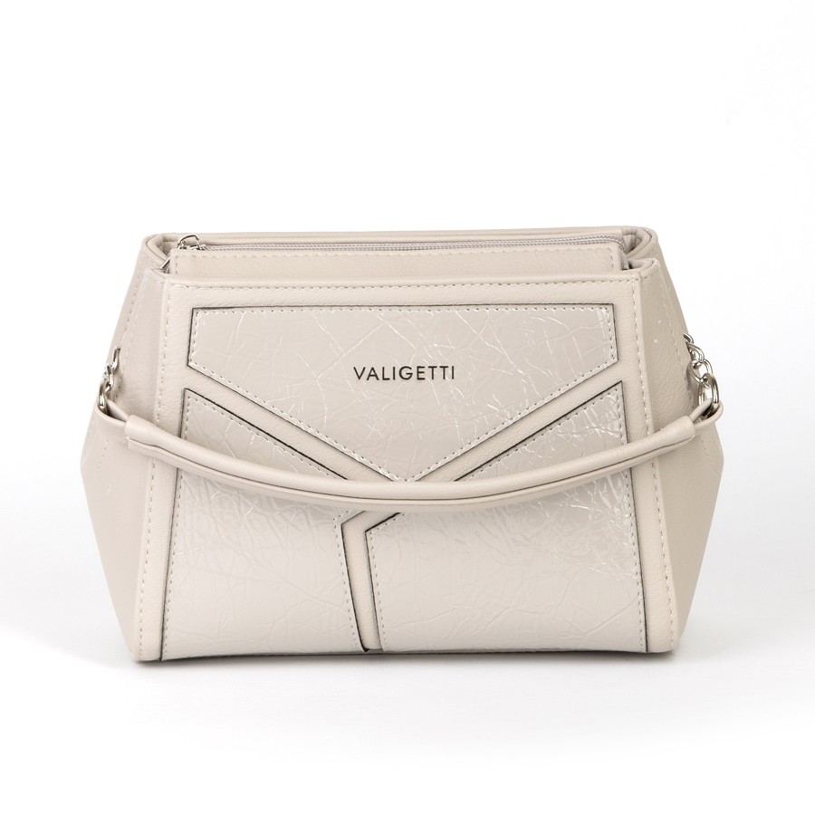 Элегантная женская сумка бренда Valigetti из экокожи с зернистой структурой. Прошита фирменной подкладочной тканью. Имеет кожаные ручки на цепочке и плечевой ремень. Внутри 3 отделения под молнией, средник на молнии, 2 кармана на молнии. На задней стороне есть карман на молнии