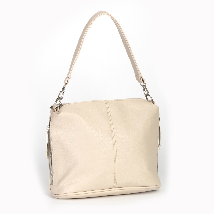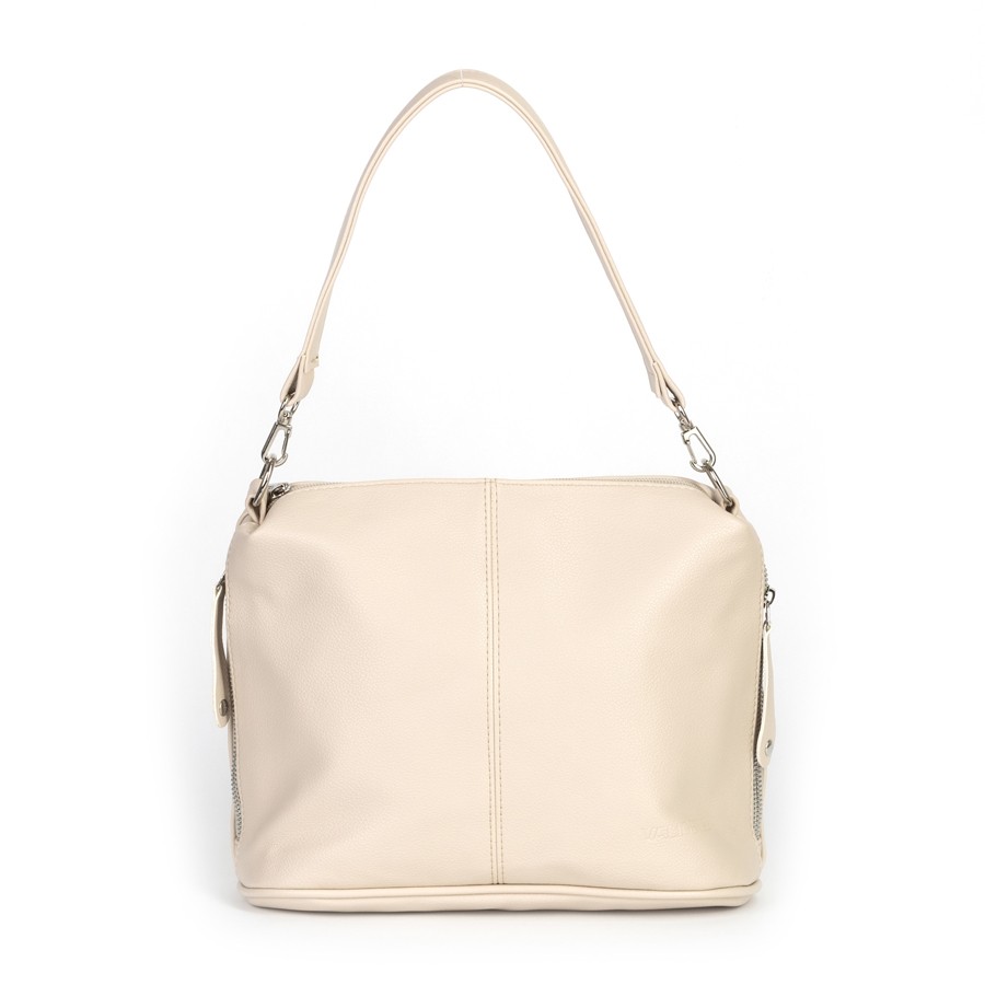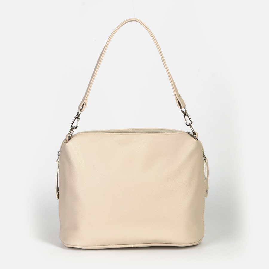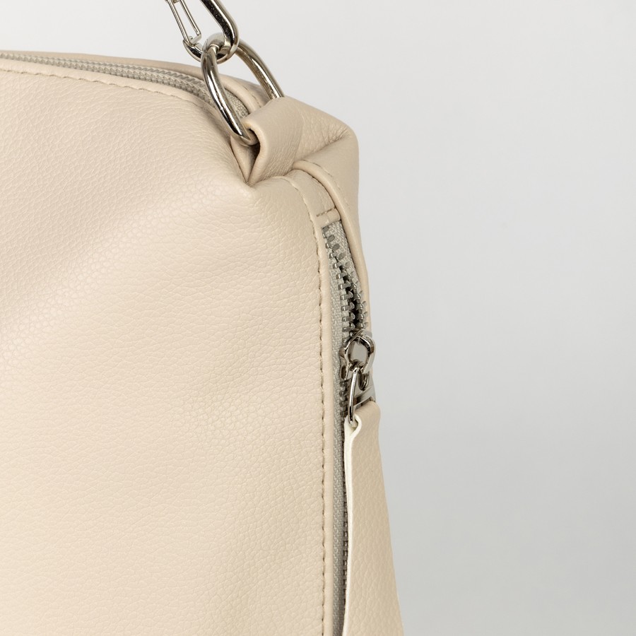 Женская сумка из бежевой искусственной кожи с мягким блеском и аккуратной текстурой. Форма — слегка округлый прямоугольник, с плечевым ремнём на металлических карабинах. На боковой части — функциональная молния с металлическим замком. Внутри карман перегородка.