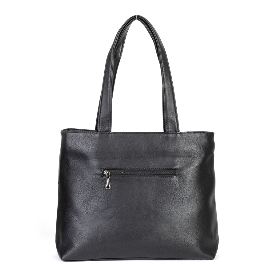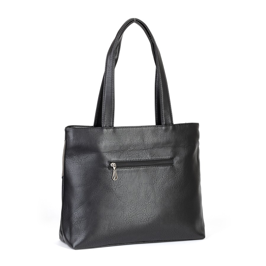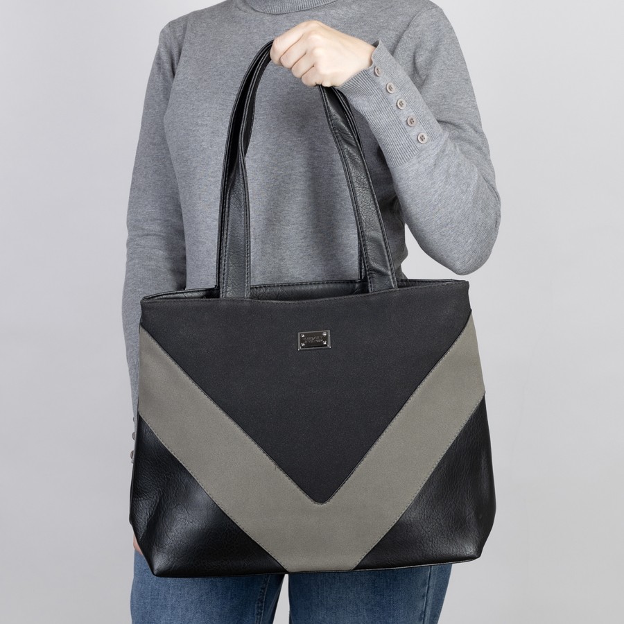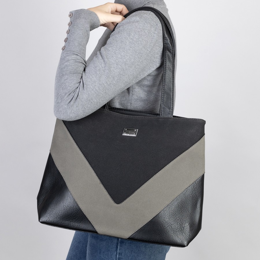Сумка от торговой марки Passo Avanti из искусственной кожи и замши. Лицевая сторона декорирована вставкой. Модель с двумя удлиненными ручками. Два отделения на молнии, с текстильной подкладкой. В заднем отделении – карман на молнии, в переднем – накладной карман. На задней стороне – карман на молнии.