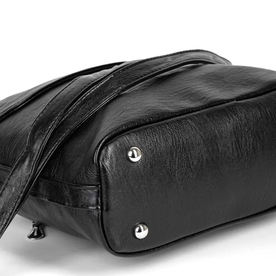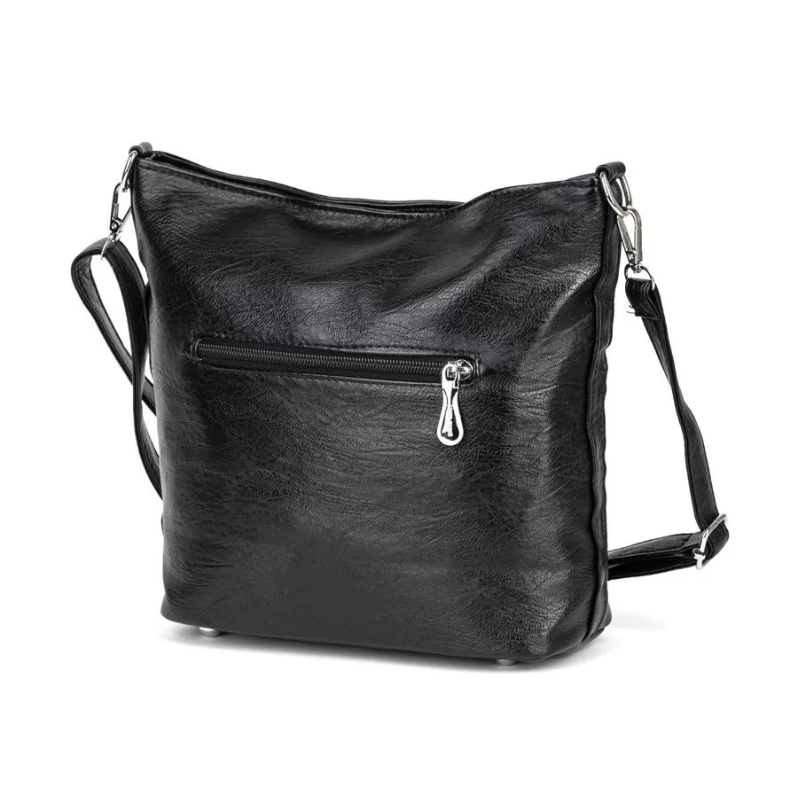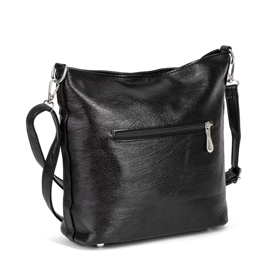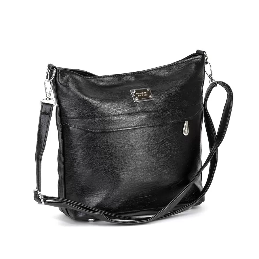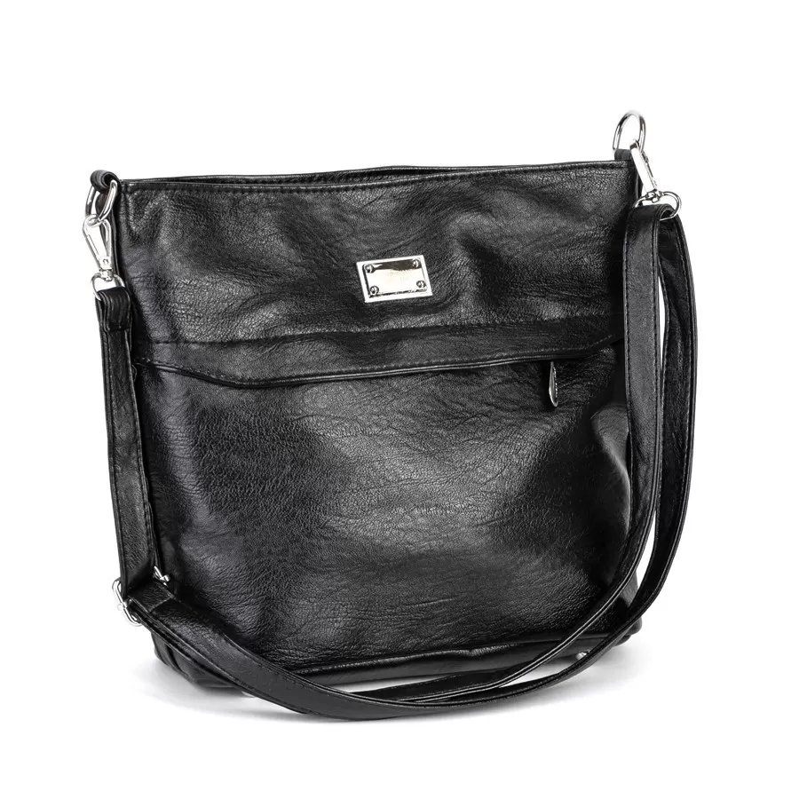 Сумка от торговой марки Passo Avanti из искусственной кожи черного цвета. Модель со съемным регулируемым плечевым ремнем. Отделение на молнии. Внутри: текстильная подкладка, средник и карман на молнии, два накладных кармана. На лицевой стороне – карман на скрытой молнии, на задней – карман на молнии. Дно оснащено металлическими ножками для защиты от износа.