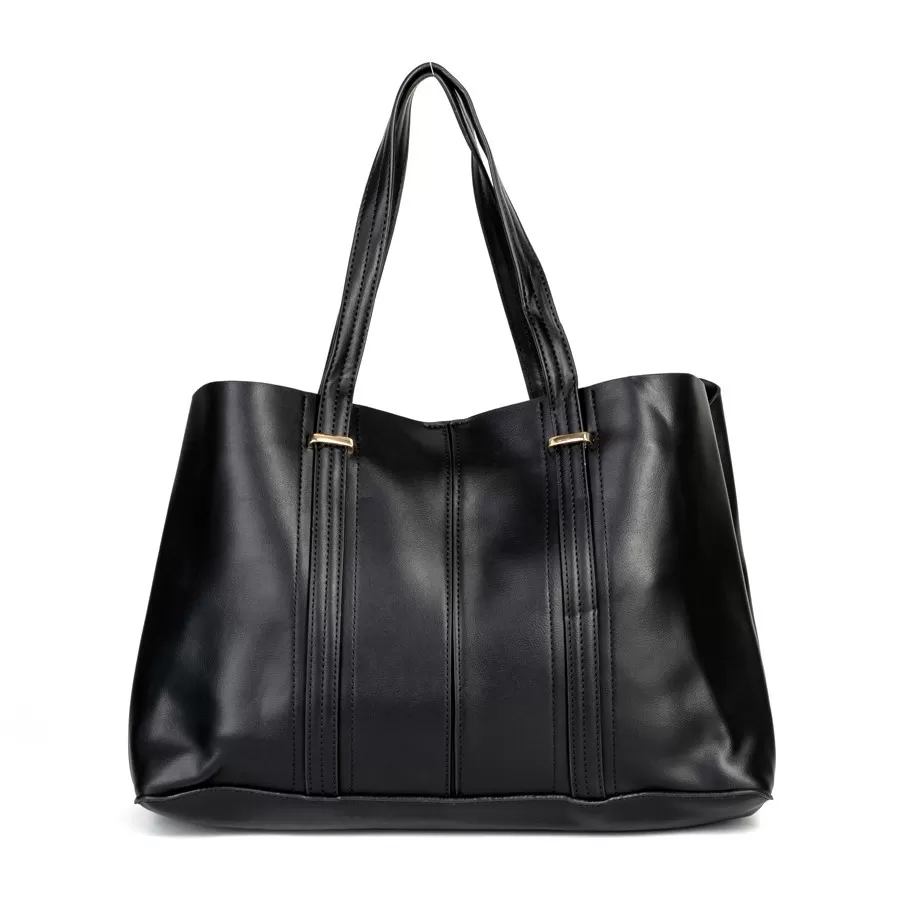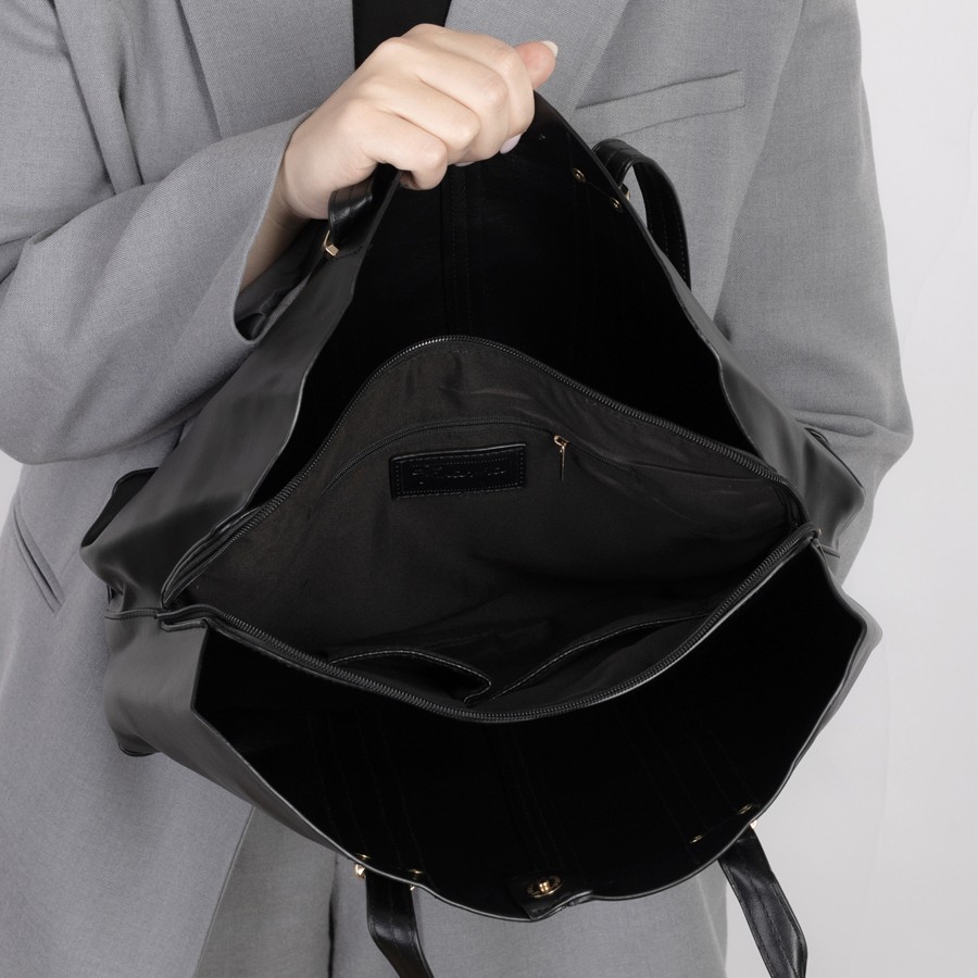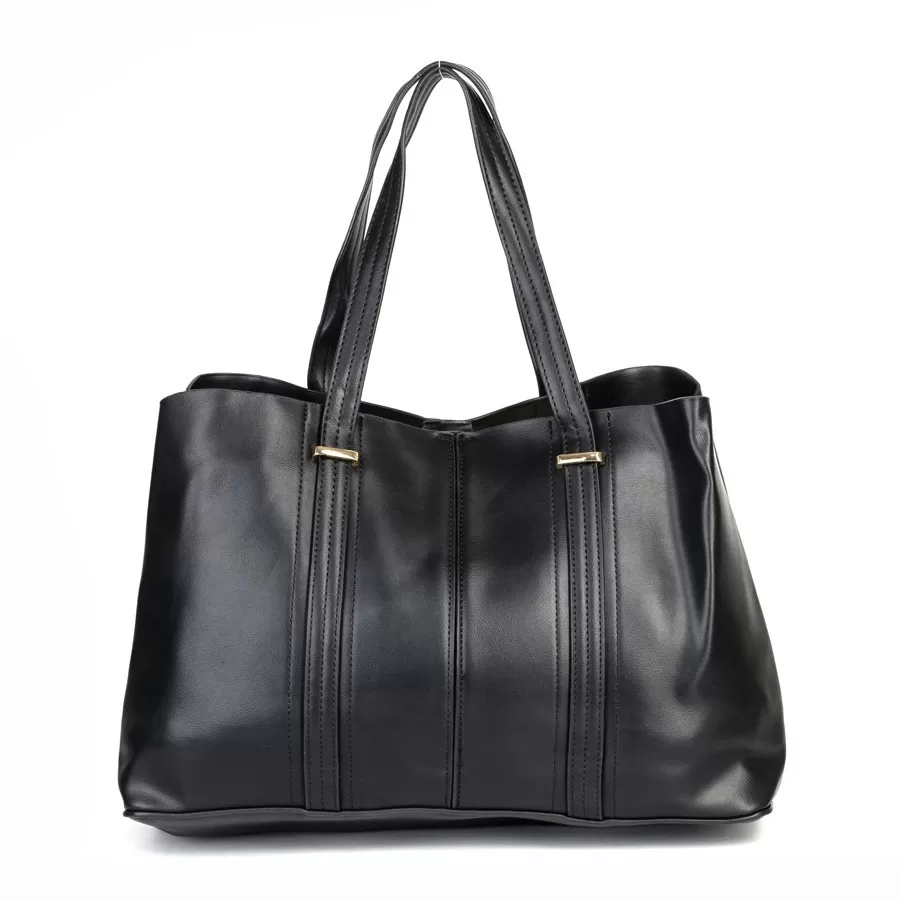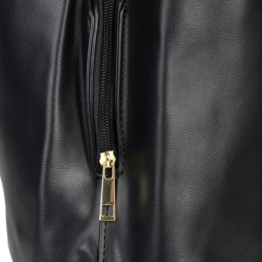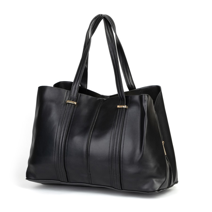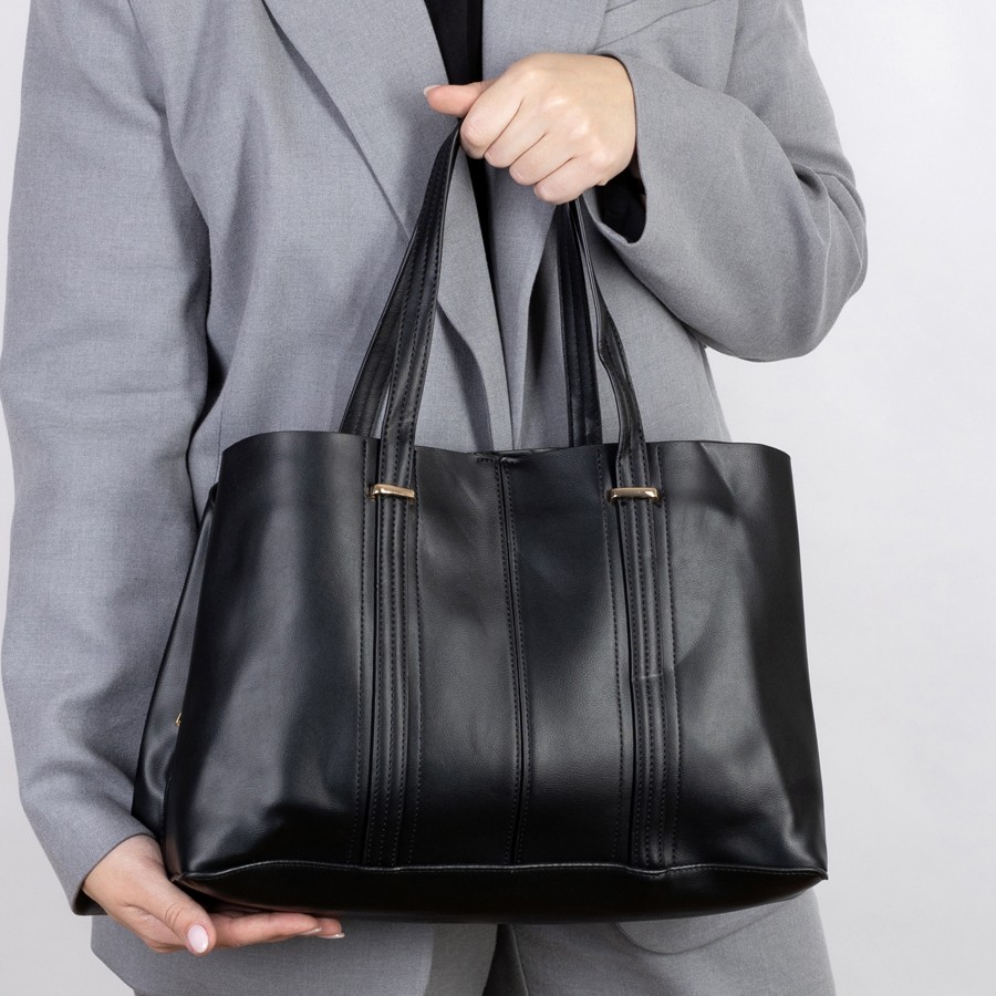 Сумка от торговой марки Marzia из искусственной кожи черного цвета с элегантным дизайном. Модель с двумя ручками. Фурнитура золотистого тона подчёркивает премиальный вид. Внутри — три просторных отделения и карманом на молнии.