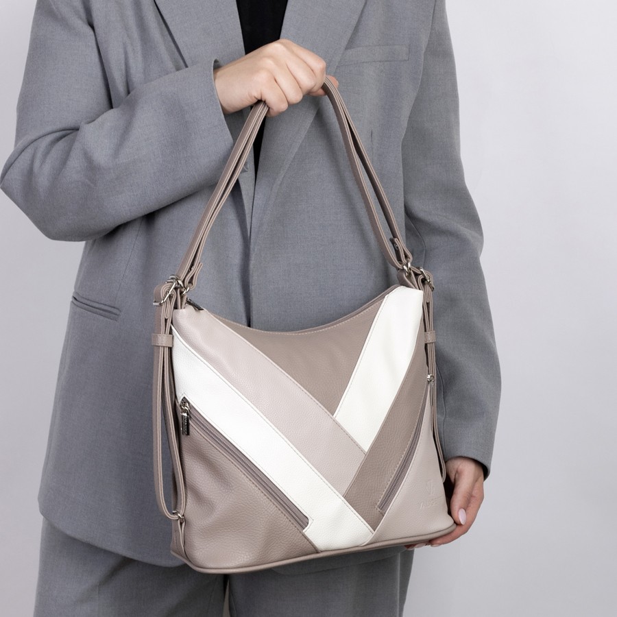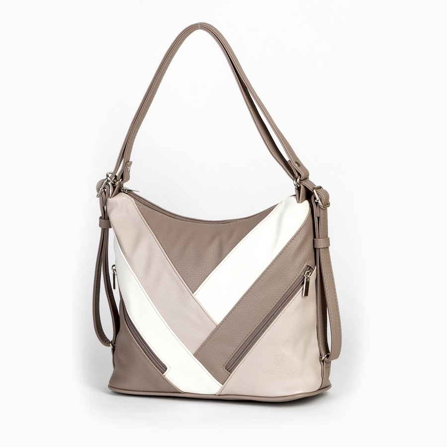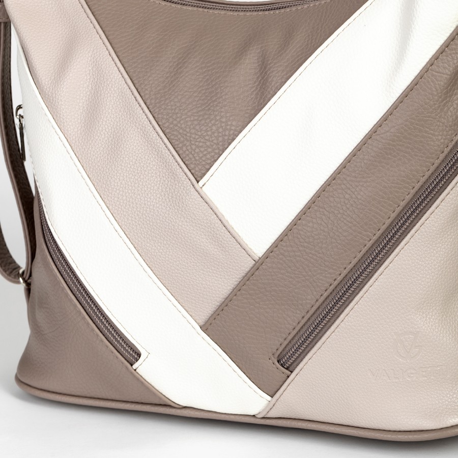 Женская сумка-рюкзак с геометрическим дизайном в спокойной цветовой гамме. Фронтальная панель оформлена в виде шеврона из оттенков тауп, бежевого, белого и светло‑коричневого. Форма — прямоугольная, с верхней молнией.