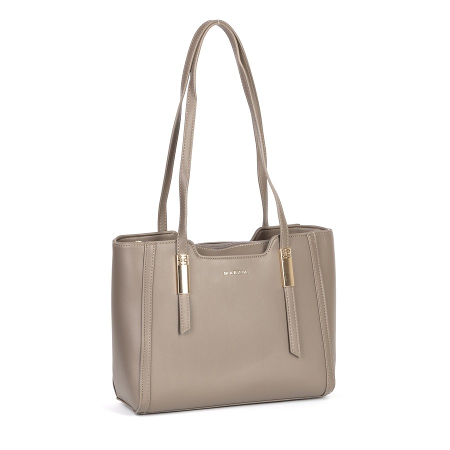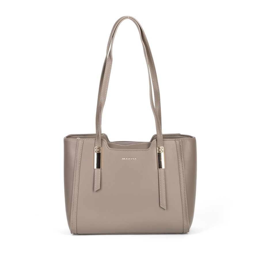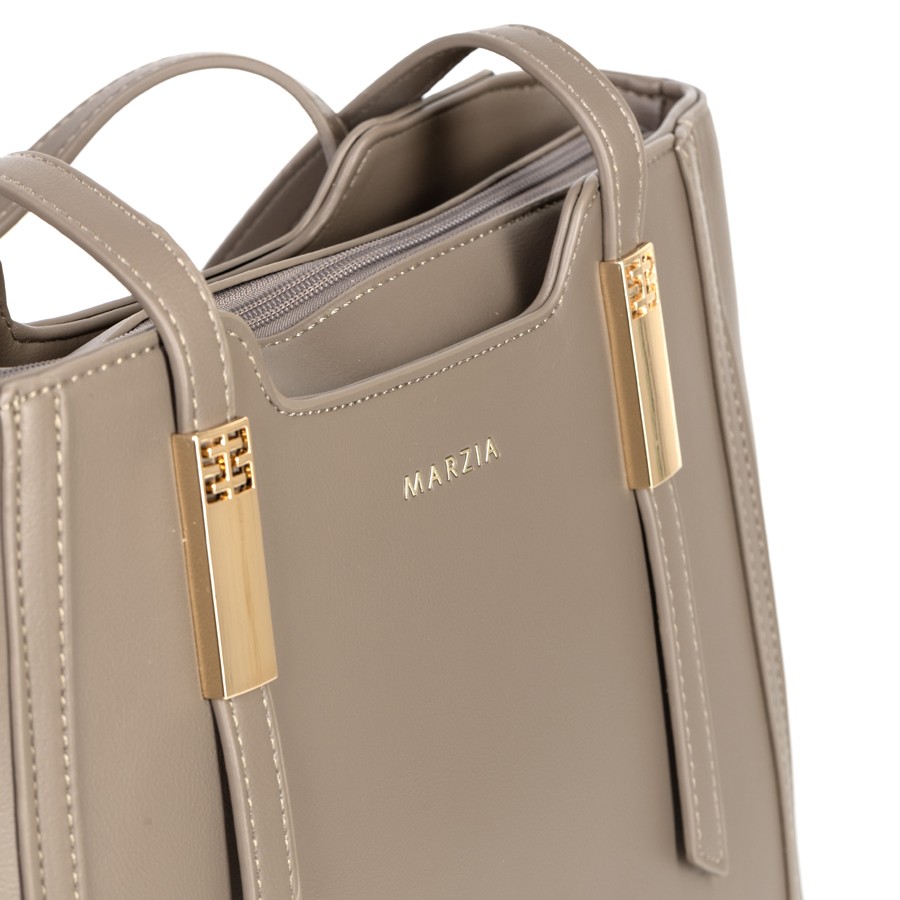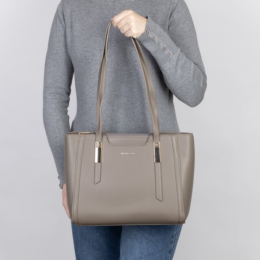 Элегантная женская сумка бренда Marzia из искусственной гладкой кожи. Прошита фирменной подкладочной тканью. Имеет пришитые кожаные ручки. Внутри 2 отделения под молнией, средник на молнии и 1 кармана на молнии. На задней стороне есть карман на молнии. Есть ножки доя постановки твердую поверхность