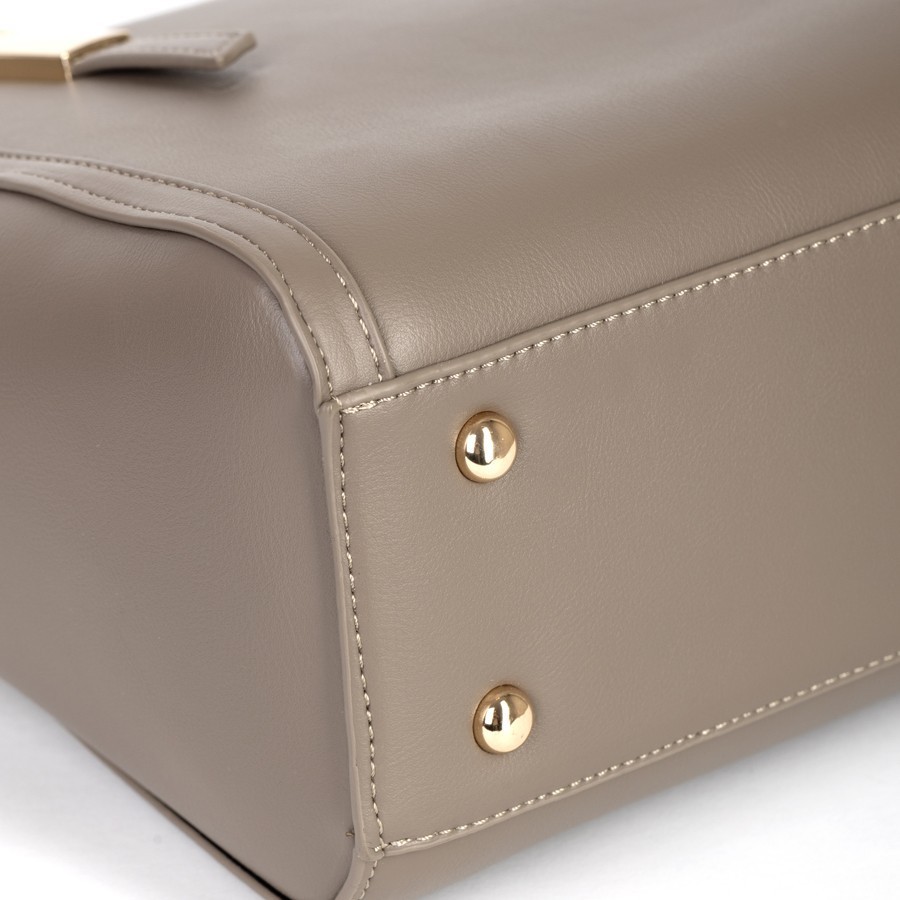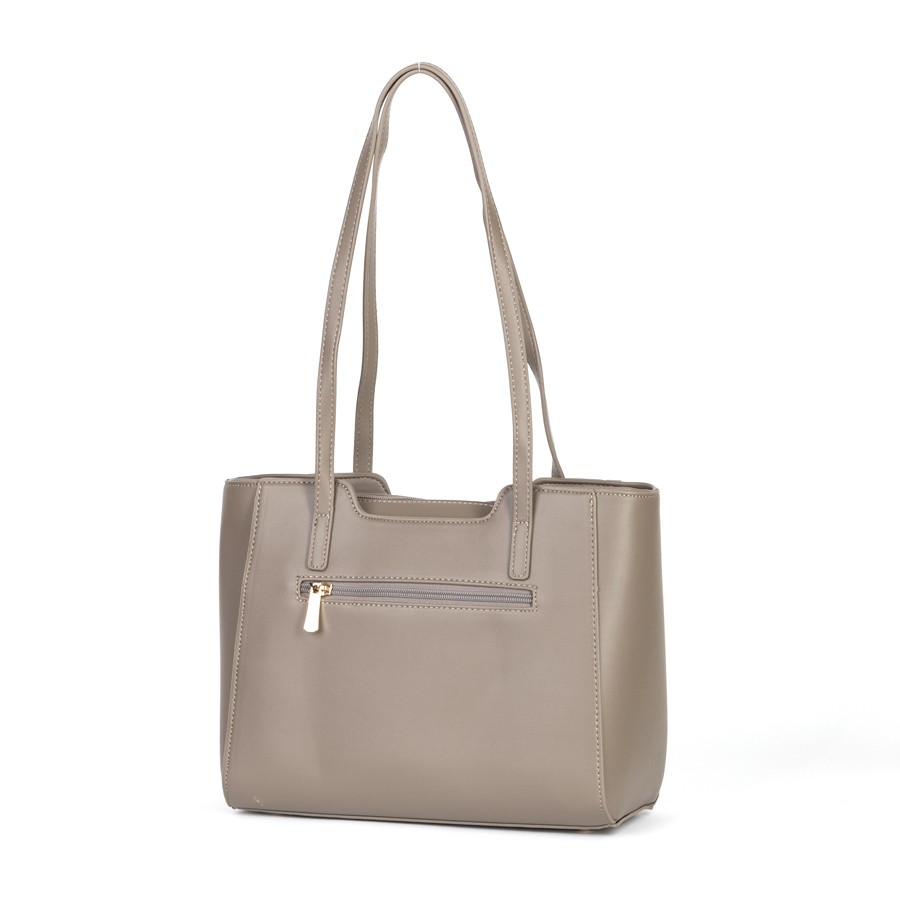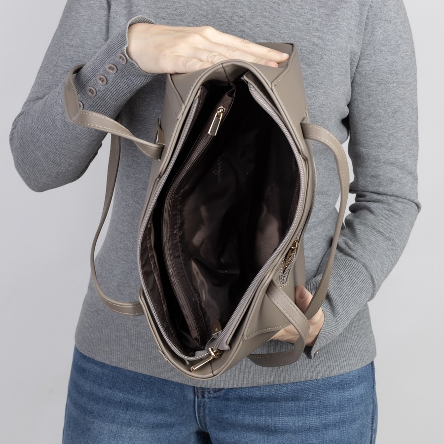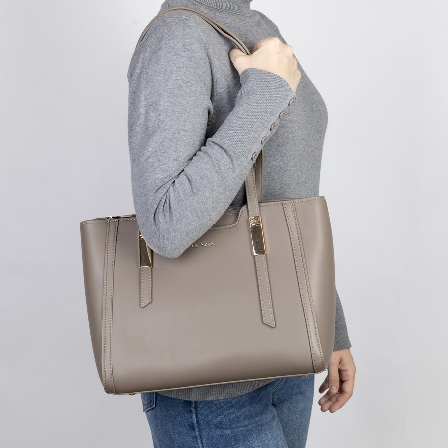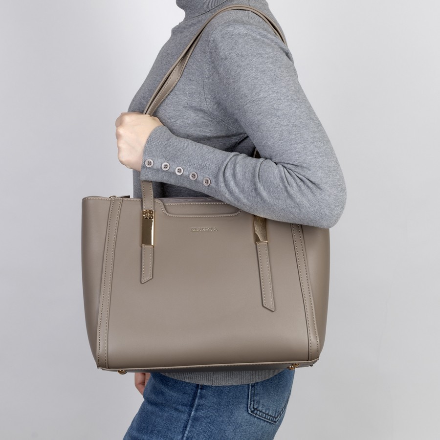 Элегантная женская сумка бренда Marzia из искусственной гладкой кожи. Прошита фирменной подкладочной тканью. Имеет пришитые кожаные ручки. Внутри 2 отделения под молнией, средник на молнии и 1 кармана на молнии. На задней стороне есть карман на молнии. Есть ножки доя постановки твердую поверхность