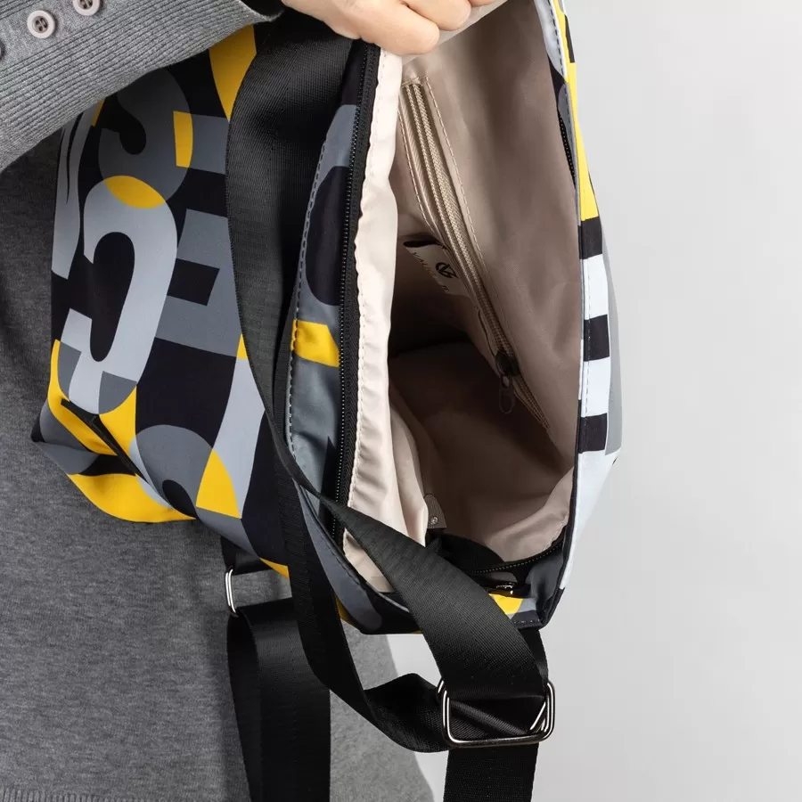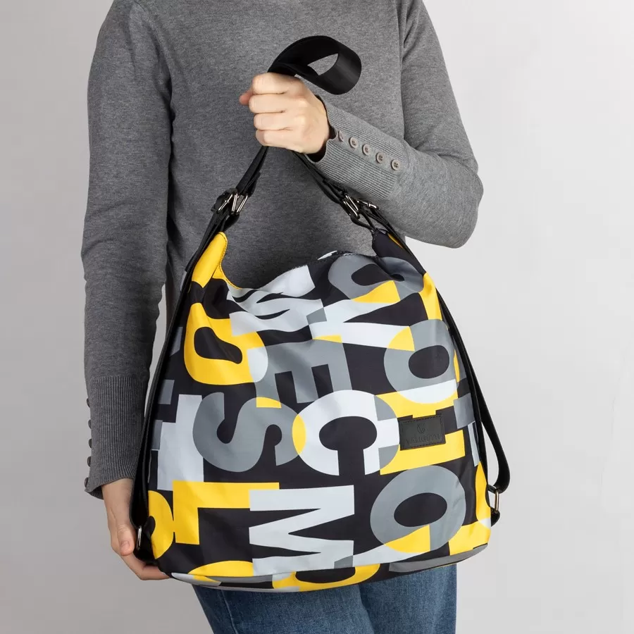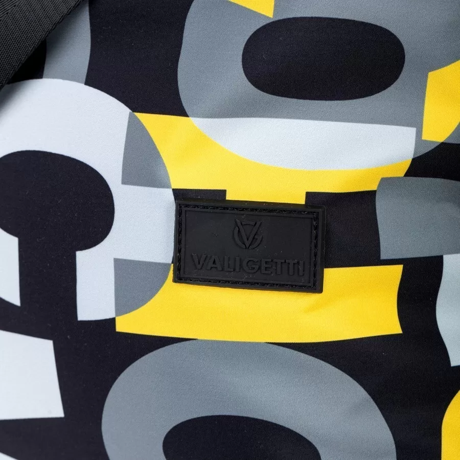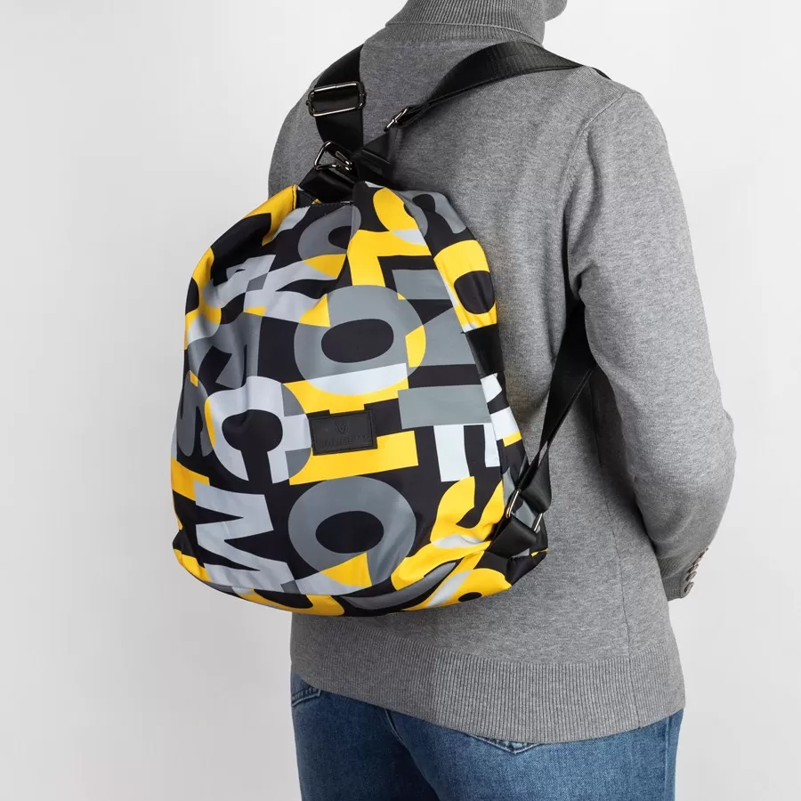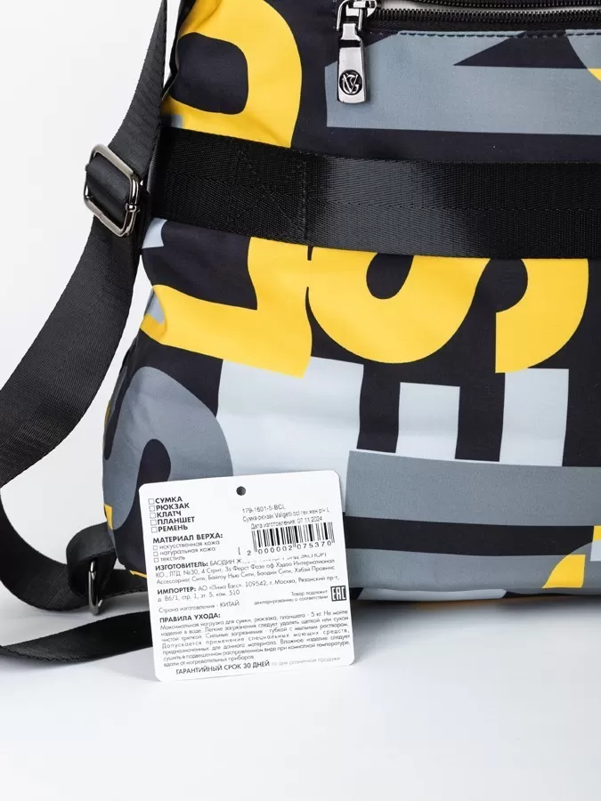 Стильная женская сумка-рюкзак бренда Valigetti из текстиля с ярким дизайном. Имеет регулируемый текстильный плечевой ремешок, перестегивающийся в лямки для ношения на спине. Внутри основного отделения под молнией карман на молнии и 2 кармашка для мелких вещей. На задней стороне имеется карман на молнии
