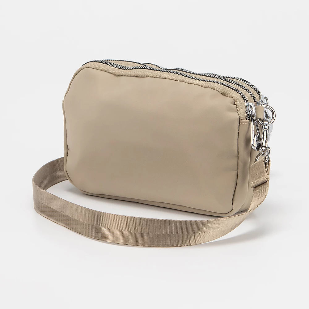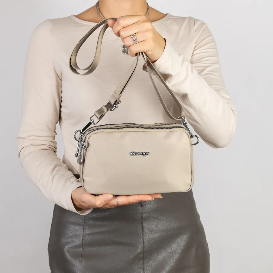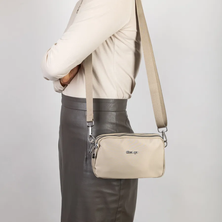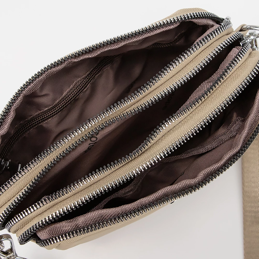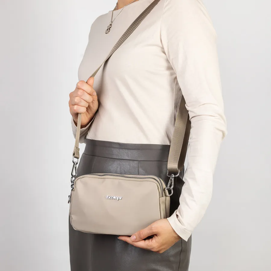 Маленькая женская текстильная сумочка бренда Ecotopе. Прошита фирменной подкладочной тканью. Имеет плечевой ремень на карабинах. Внутри 3 отделения. В отделении ближе к лицевой стороне есть также кармашек для мелких вещей
