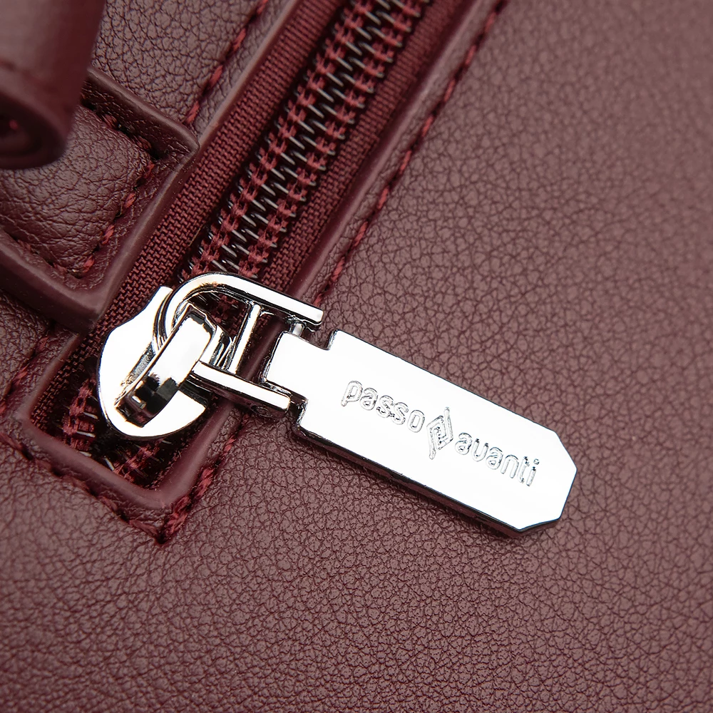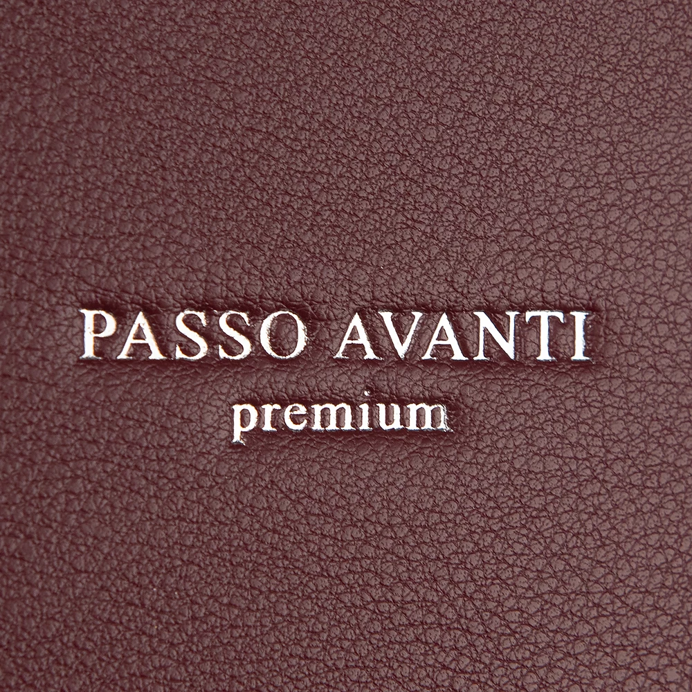 Сумка от бренда Passo Avanti из искусственной кожи бордового цвета. Модель с двумя ручками и съемным регулируемым плечевым ремнем. Два отделения на молнии. Внутри: текстильная подкладка, карман на молнии, накладной карман. С задней стороны — карман на молнии. Дно оснащено металлическими ножками для защиты от износа.