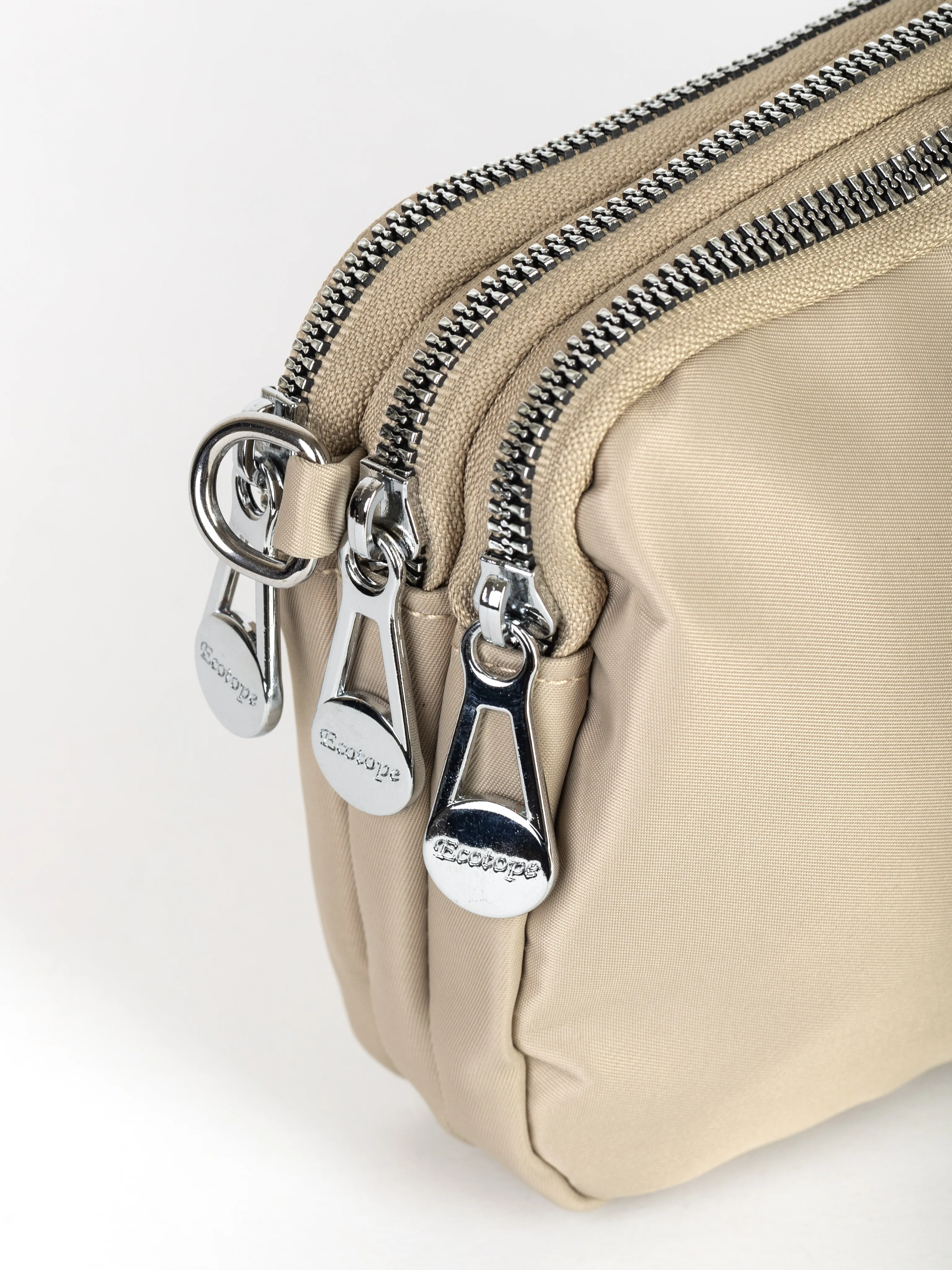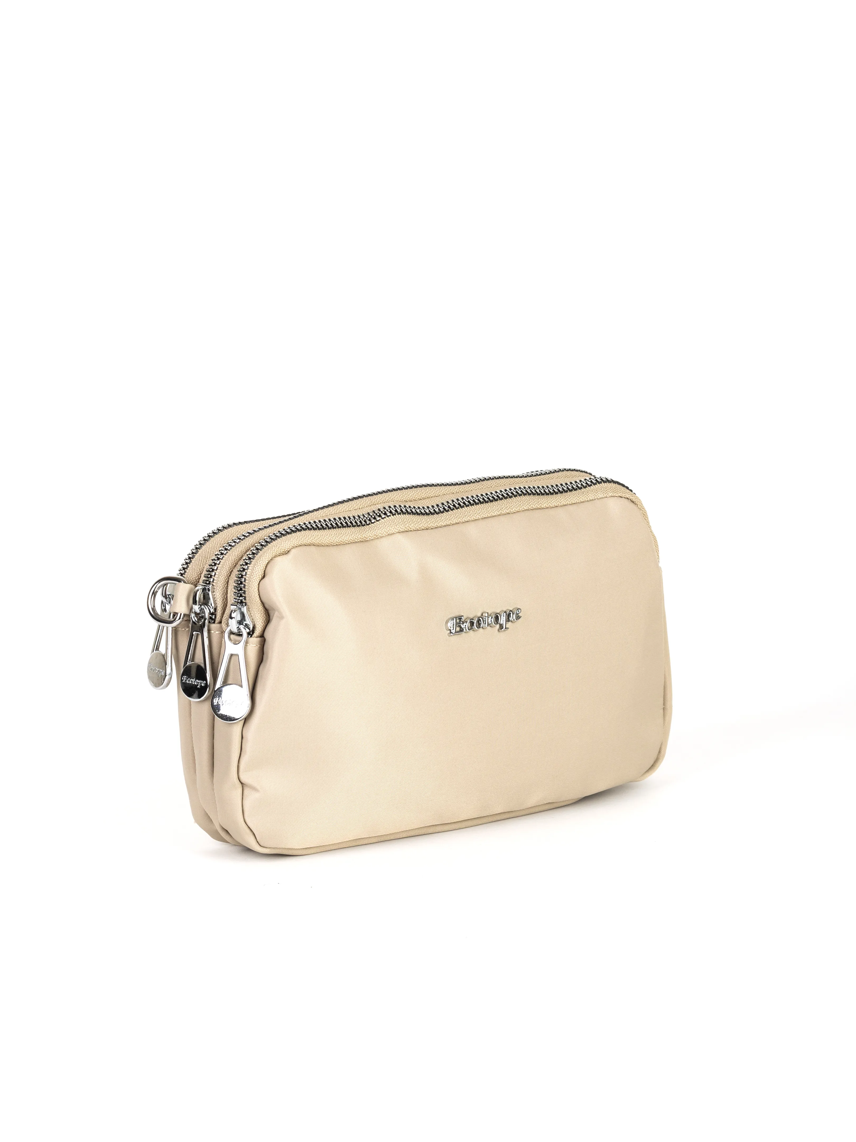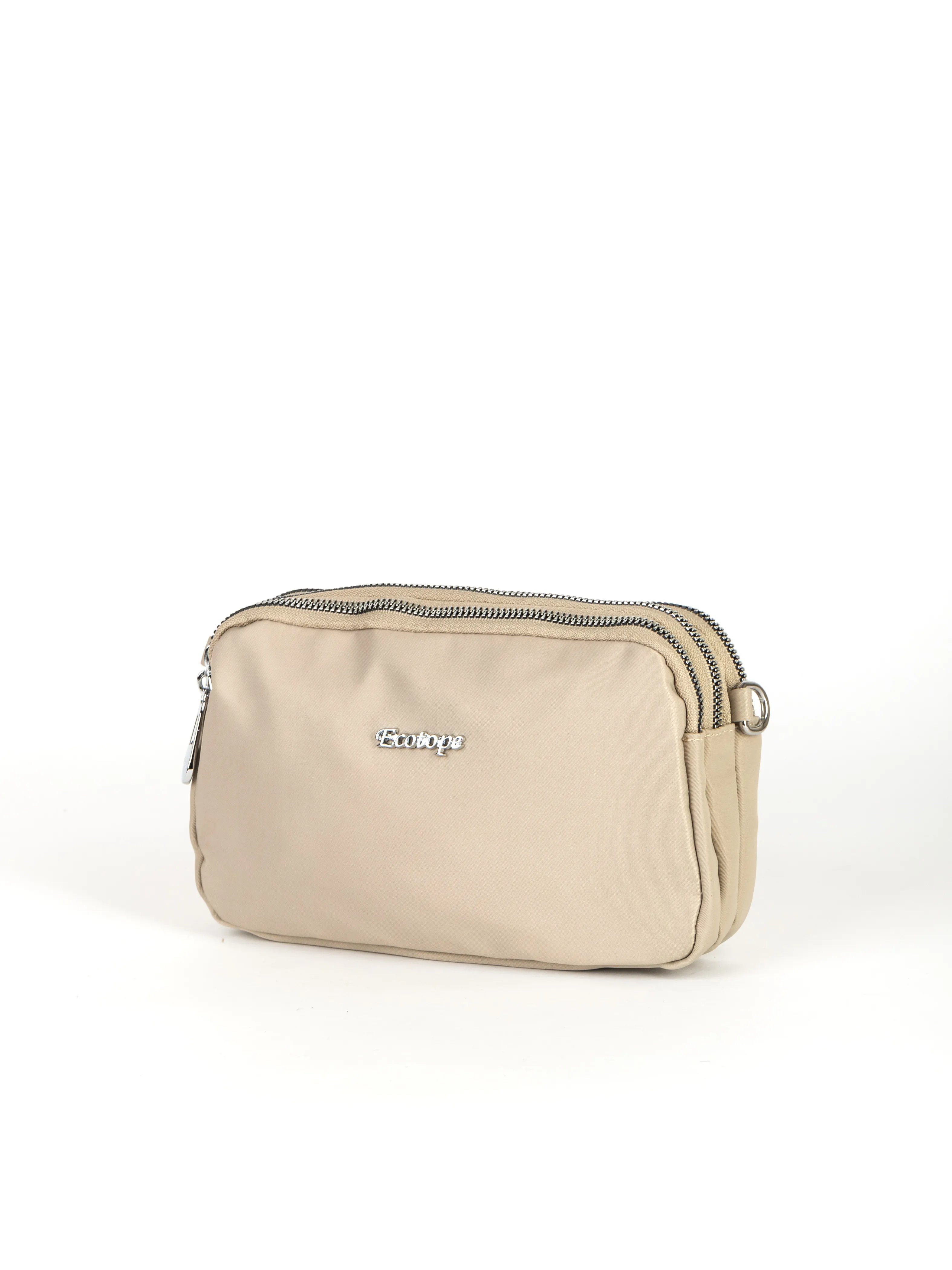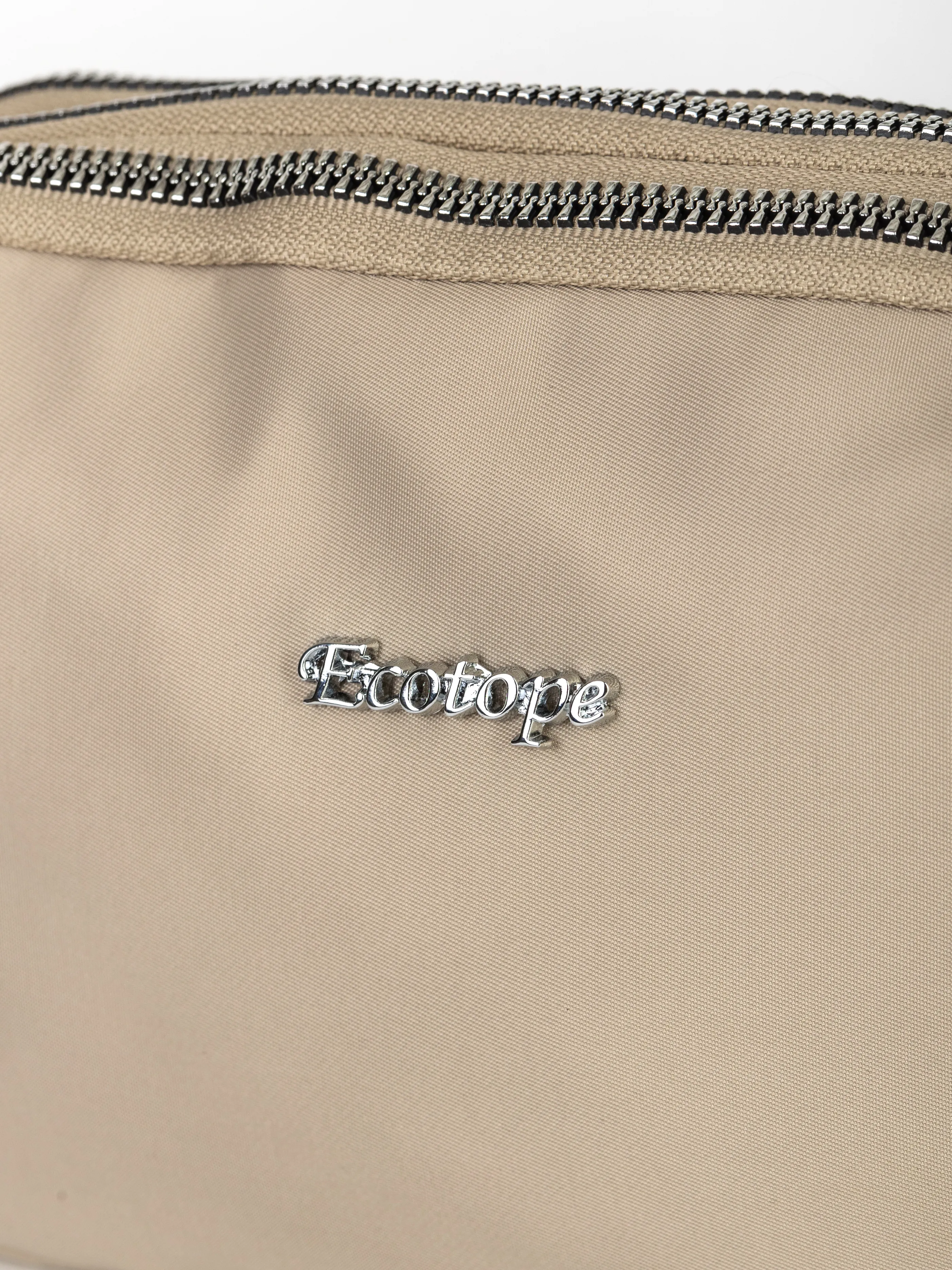 Сумка-планшет от бренда Ecotope из практичного текстильного материала бежевого цвета. Модель со съемным регулируемым плечевым ремнем. Три отделения на молнии, с текстильной подкладкой. Внутри карман на молнии и накладной карман. На задней стороне — карман на молнии.