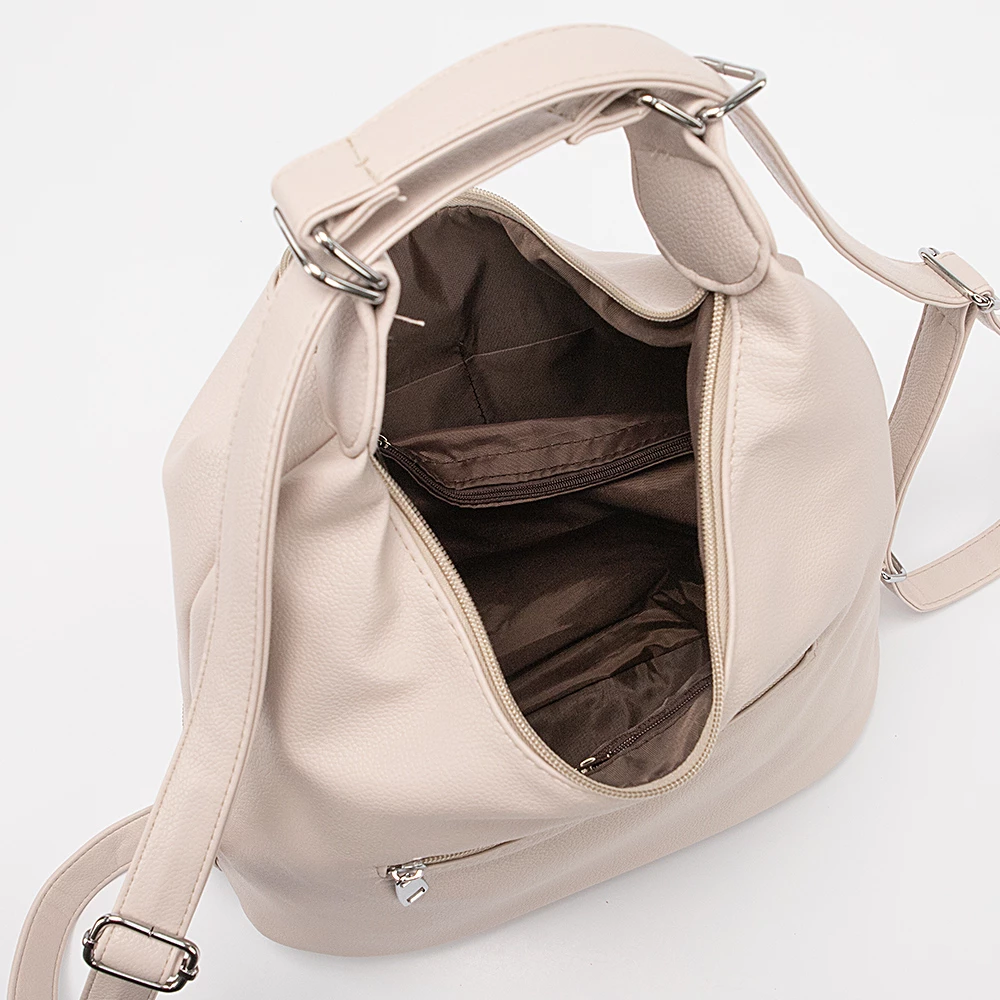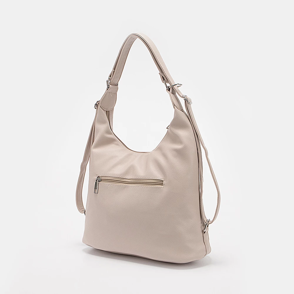 Сумка-рюкзак от бренда Passo Avanti из искусственной кожи в сочетании бежевого и кофейного цвета. Лицевая сторона декорирована вставкой с тиснением под рептилию. Вместительная модель с двумя ручками, которые стягиваются в плечевые лямки. Отделение на молнии. Внутри: средник и карман на молнии, два накладных кармана. На лицевой и задней сторонах – карман на молнии.