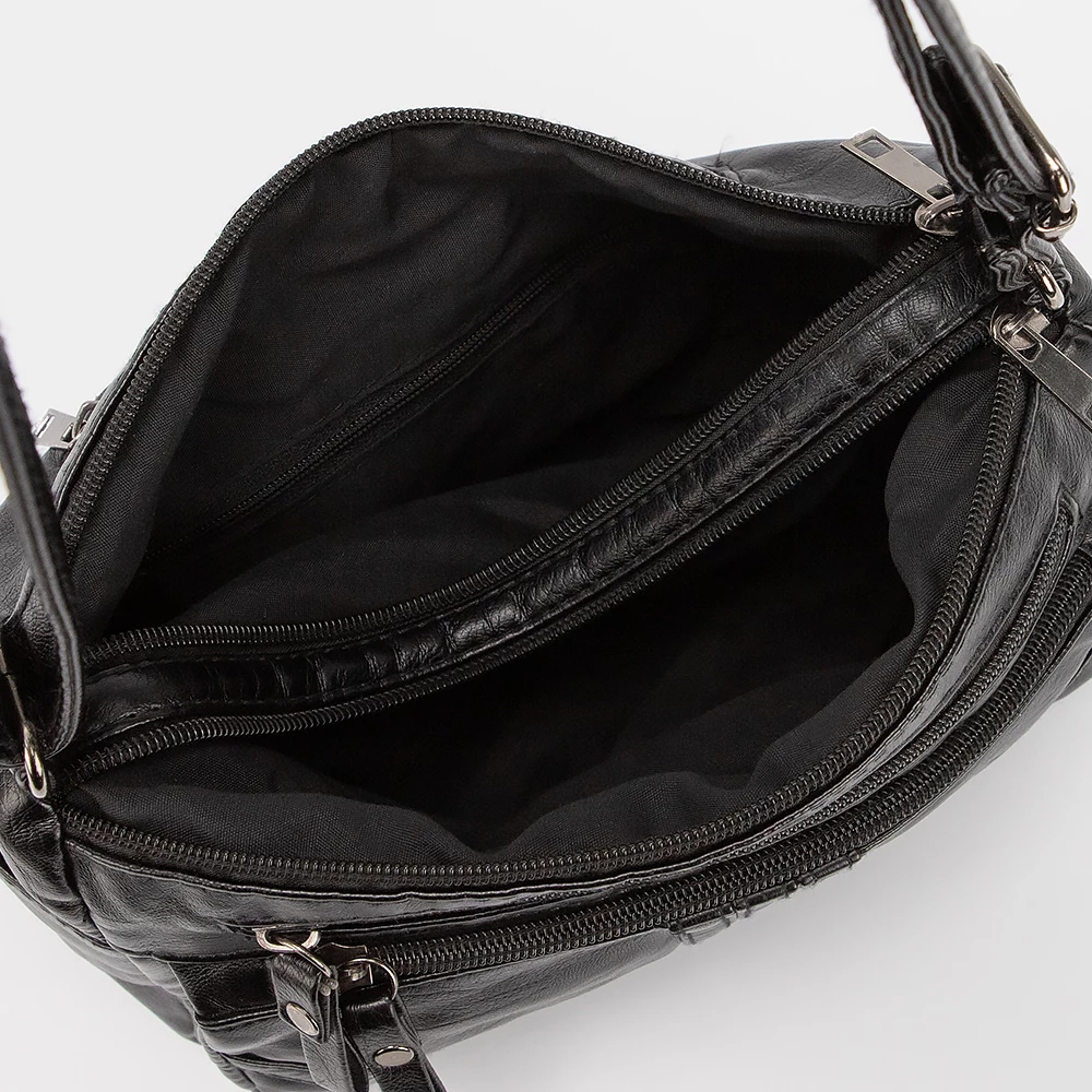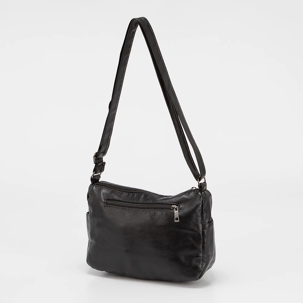 Сумка от бренда Passo Avanti выполнена из искусственной кожи черного цвета. Модель с длинным регулируемым плечевым ремнем. Два отделения на молнии. Внутри: текстильная подкладка, карман на молнии, накладной карман. На лицевой стороне — два кармана на молнии. По бокам — карманы без застежки. С задней стороны — карман на молнии.