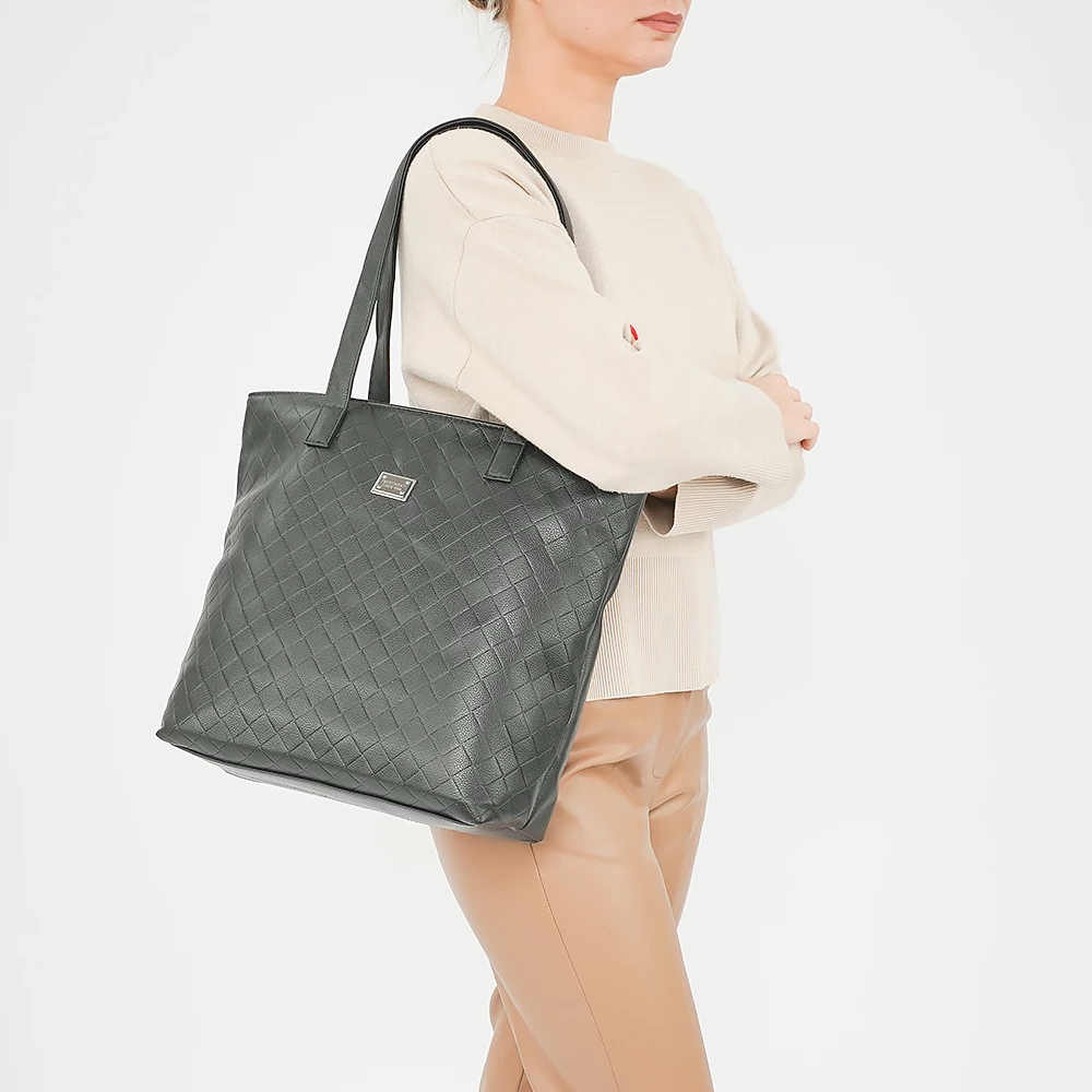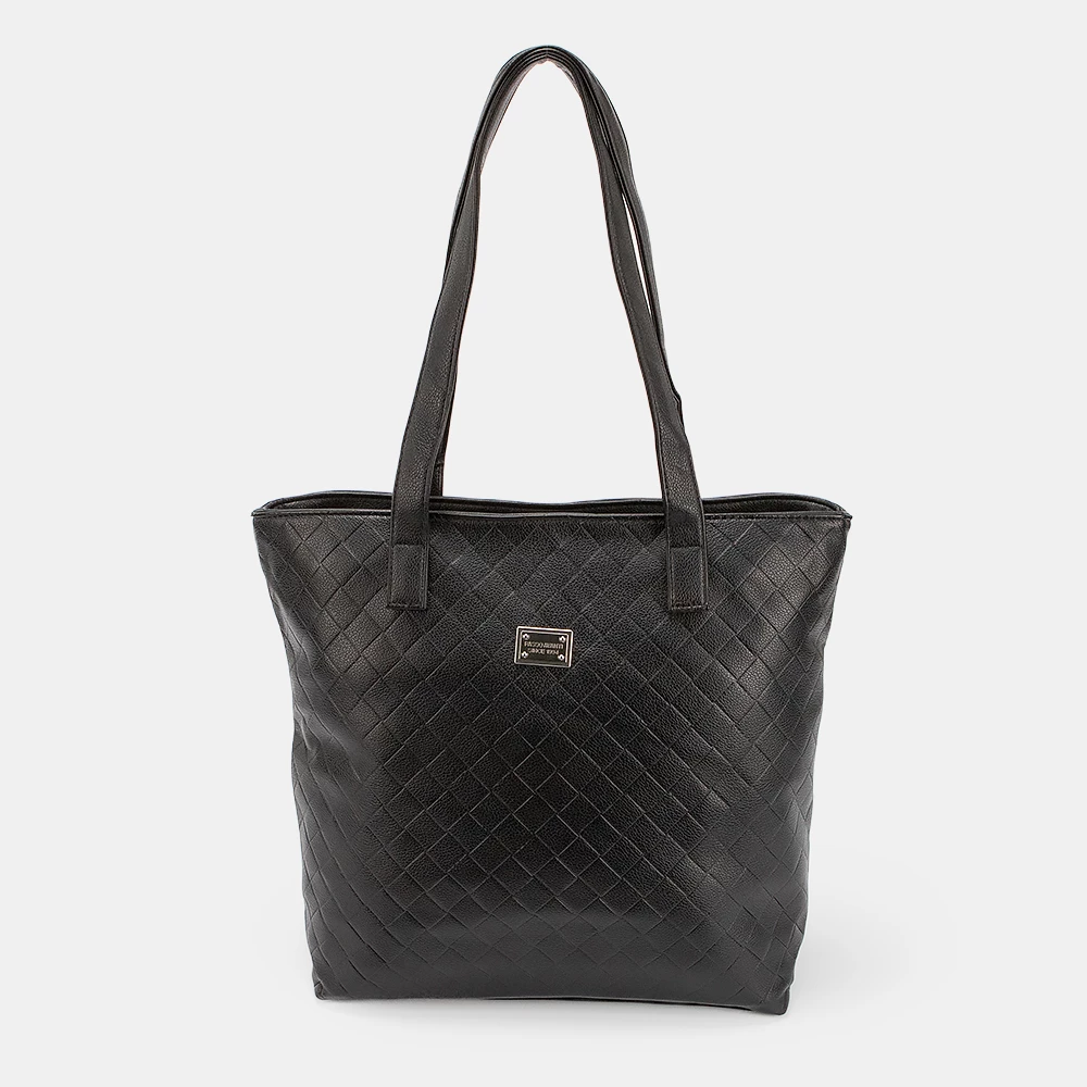 Сумка от бренда Passo Avanti из искусственной кожи. Лицевая сторона декорирована ромбовидным блинтовым тиснением. Модель с двумя удлиненными ручками. Отделение на молнии. Внутри: текстильная подкладка, средник и карман на молнии, два накладных кармана. На задней стороне – карман на молнии.