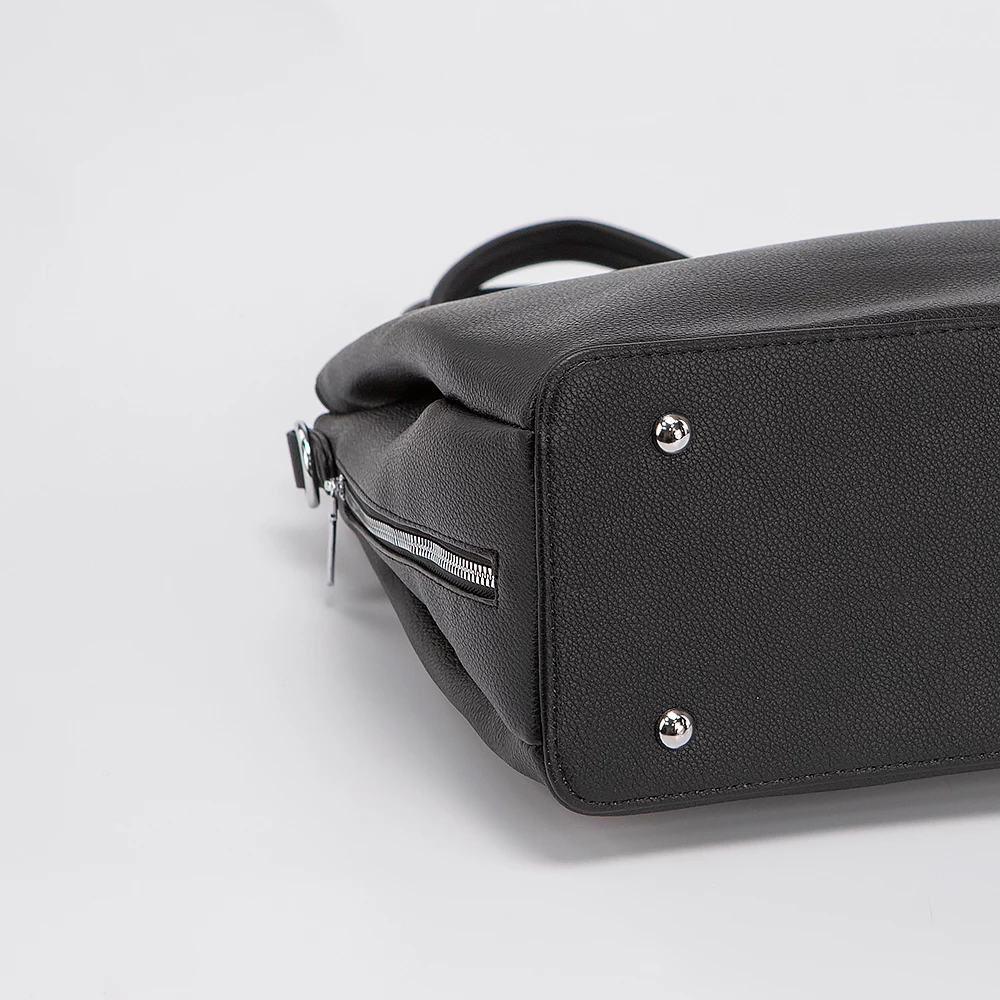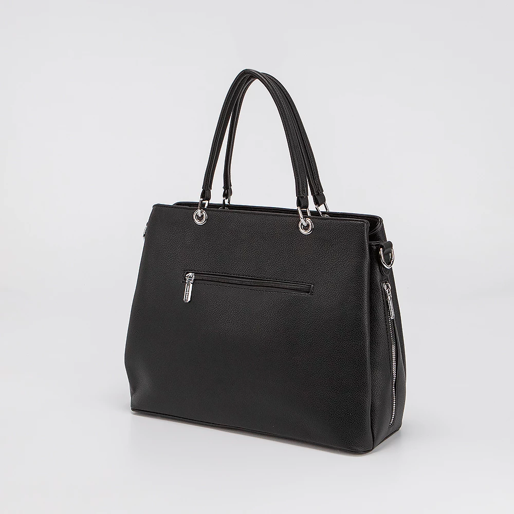 Сумка от бренда Passo Avanti выполнена из искусственной кожи черного цвета. Модель с двумя ручками и съемным регулируемым плечевым ремнем. Отделение на молнии. Внутри: три отсека, текстильная подкладка, карман на молнии, накладной карман. С задней стороны — карман на молнии. Дно оснащено металлическими ножками для защиты от износа.