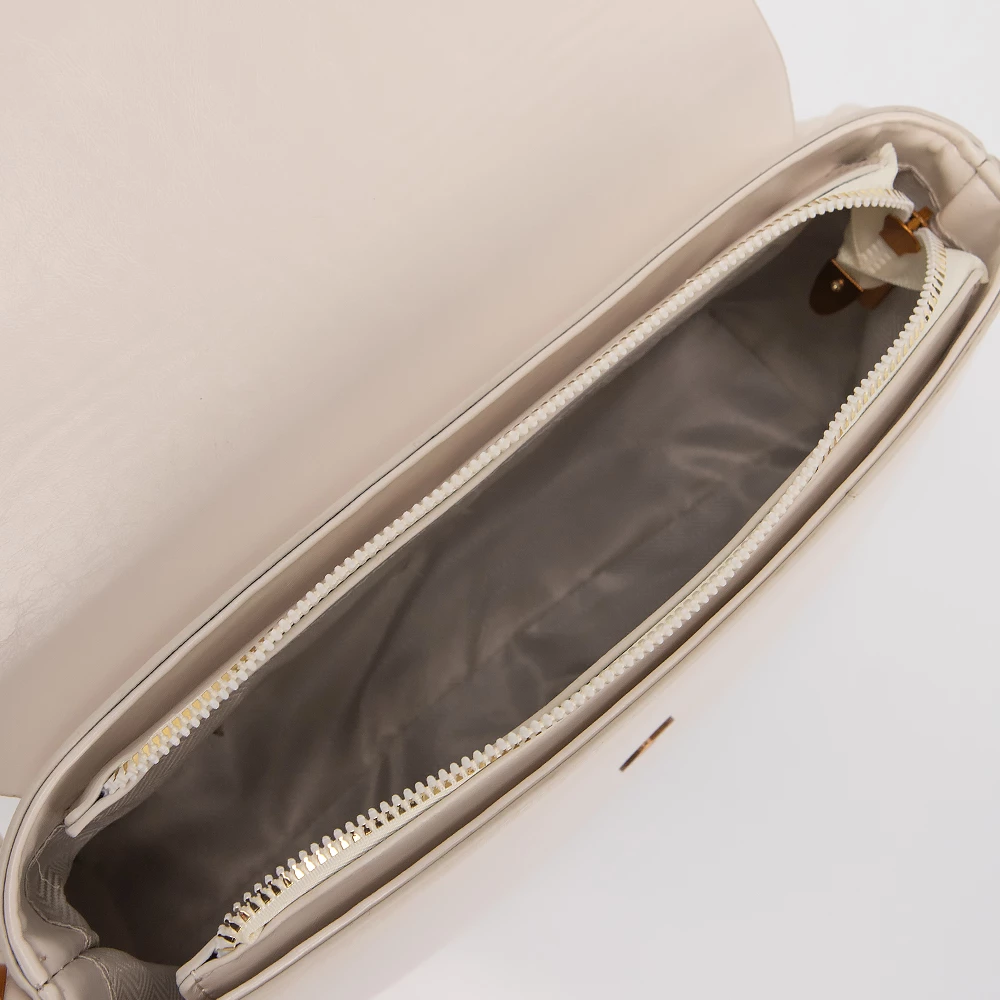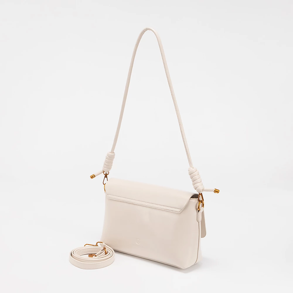 Сумка от бренда Valigetti выполнена из искусственной кожи бежевого цвета. Модель с двумя съемными плечевыми ремнями: длинным регулируемым и тонким коротким, декорированным узлами. Клапан на магнитной кнопке закрывает отделение на молнии. Внутри: текстильная подкладка, карман на молнии, накладной карман.