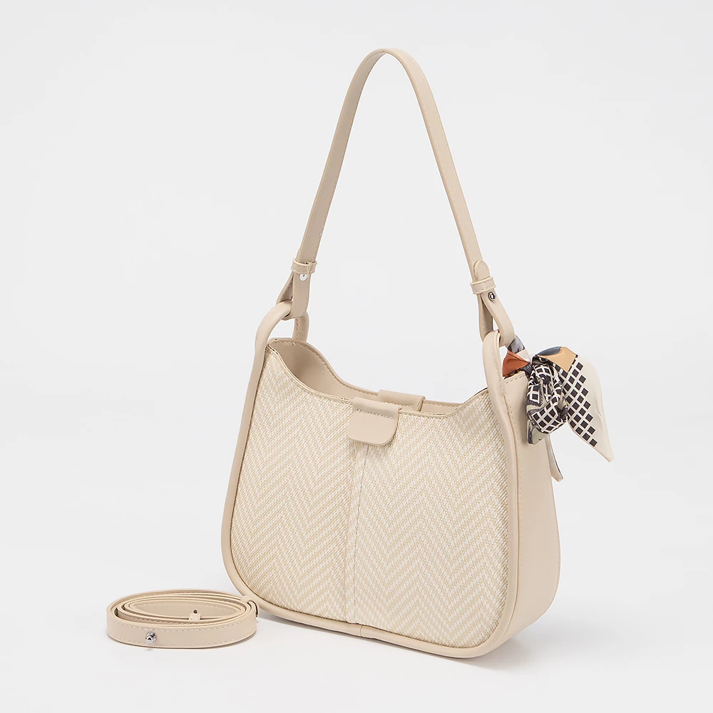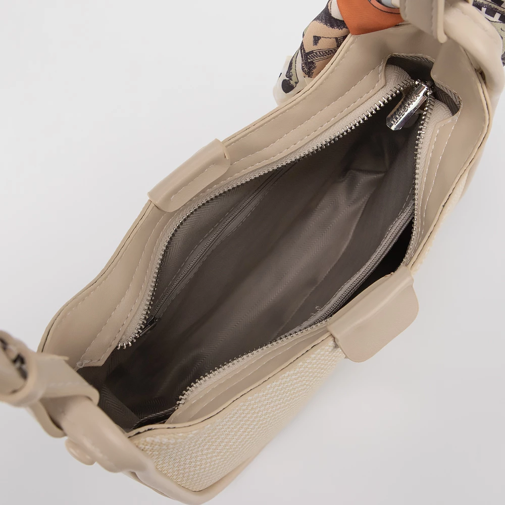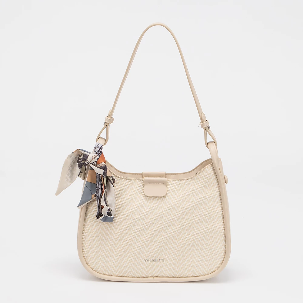 Сумка от бренда Valigetti выполнена из искусственной кожи с текстильными вставками с узором. Модель с длинной ручкой и съемным регулируемым плечевым ремнем. Декорирована платком твилли. Отделение на молнии. Внутри: текстильная подкладка, карман на молнии, накладной карман.