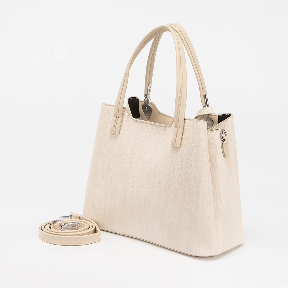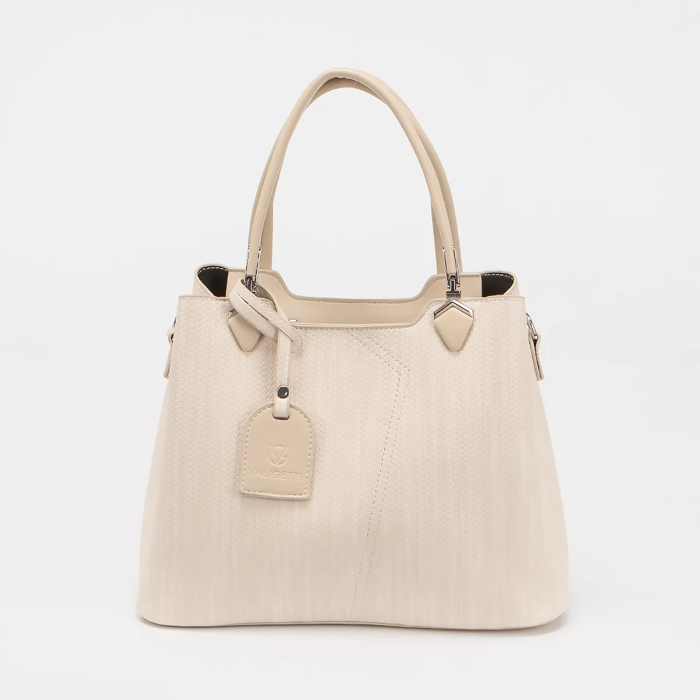 Сумка от бренда Valigetti выполнена из искусственной кожи бежевого цвета. Модель с двумя ручками и съемным регулируемым плечевым ремнем. Декорирована подвеской. Три отделения: среднее — на молнии, боковые — на магнитной кнопке. Внутри: текстильная подкладка, карман на молнии, накладной карман.
