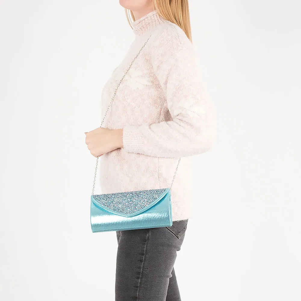 Элегантный клатч от бренда Passo Avanti выполнен из текстильного материала голубого цвета с эффектом металлик. Жесткая модель в форме футляра, со съемной серебристой цепочкой. Закрывается клапаном на магнитной кнопке. Клапан декорирован мерцающими блестками. Внутри: текстильная подкладка и накладной карман.