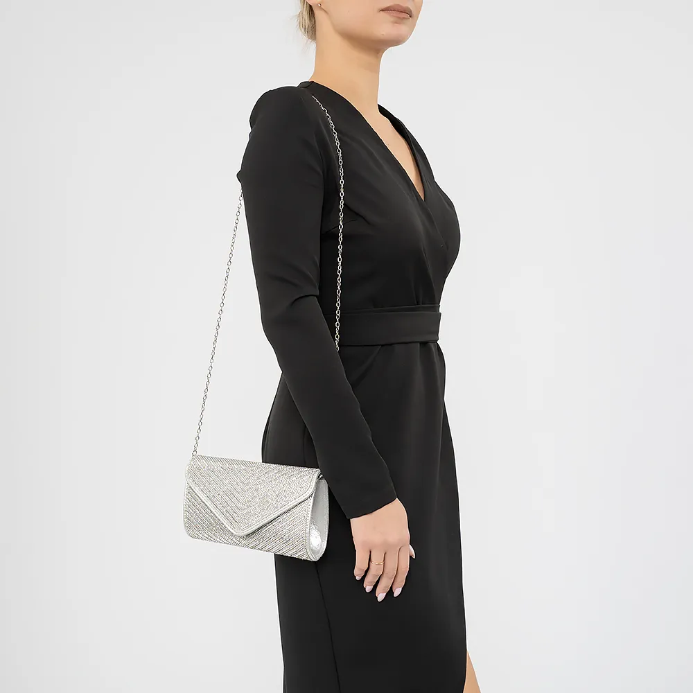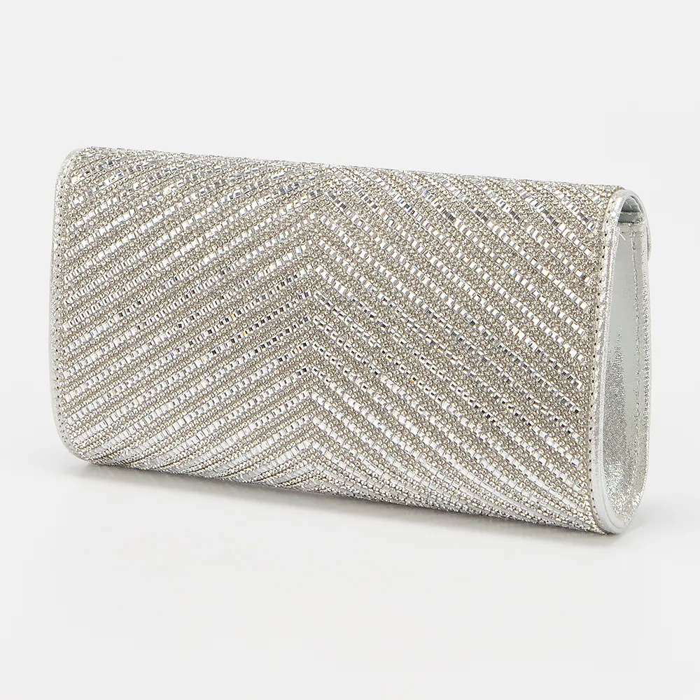 Клатч от торговой марки Passo Avanti. Модель серебряного цвета; декорирована стразами и стеклярусом. Закрывается клапаном на магнитной кнопке; имеется съемная цепочка. Внутри: текстильная подкладка, накладной карман.