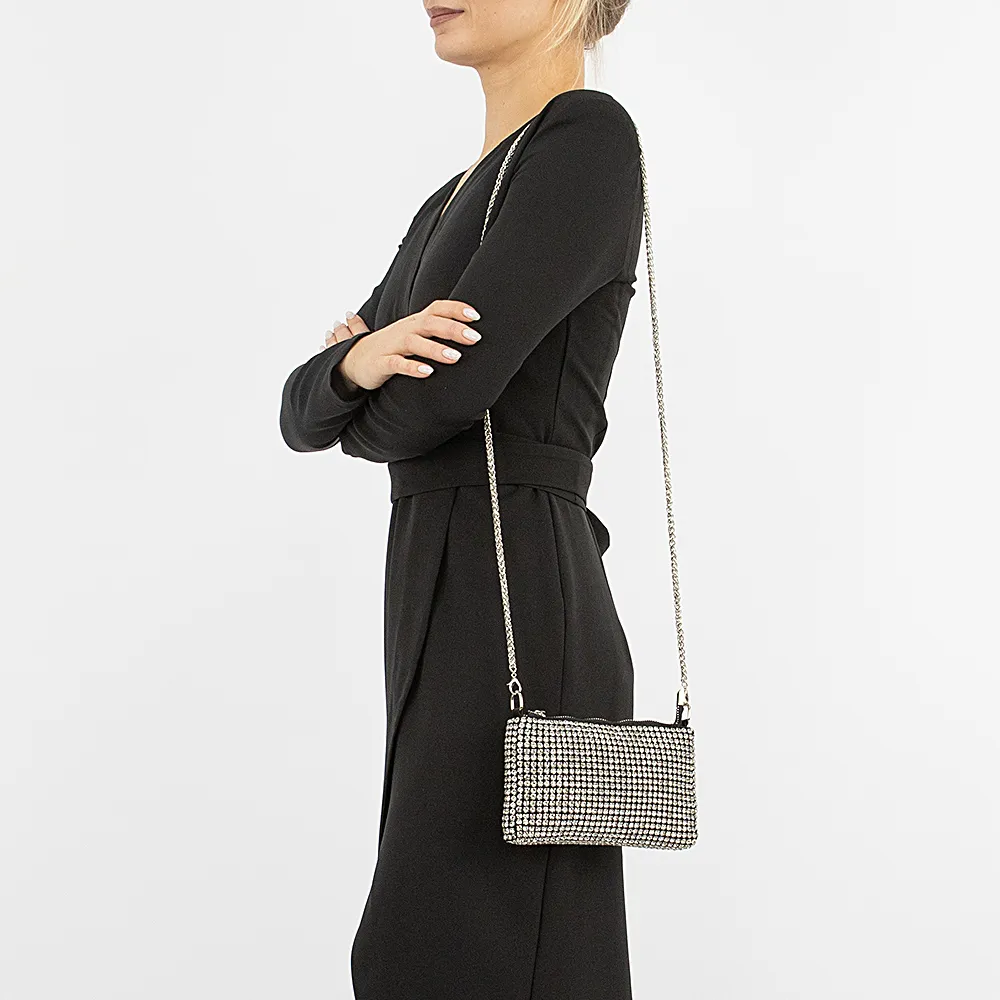 Клатч от торговой марки Passo Avanti из текстильного материала. Мягкая модель с уплотненными стенками; декорирована стразами. Имеется съемная крупная цепочка с оригинальным плетением. Отделение на молнии. Внутри: текстильная подкладка.