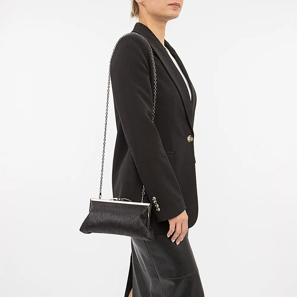 Клатч от торговой марки Marzia из искусственной кожи серебряного цвета с эффектной лазерной обработкой и тиснением под рептилию. Модель со съемным плечевым ремнем-цепочкой. Имеет рамочный вид закрытия фермуар. Внутри отделения: фирменная подкладка, накладной карман.