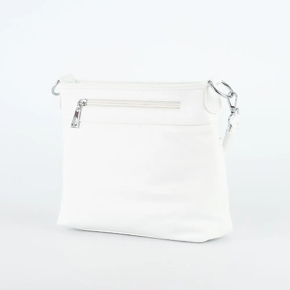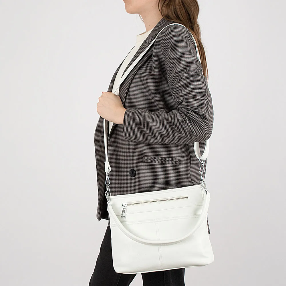 Сумка от торговой марки Passo Avanti выполнена из искусственной кожи белого цвета. Квадратная модель со съемной ручкой и съемным регулируемым плечевым ремнем. Отделение на молнии. Внутри: текстильная подкладка, средник и карман на молнии, накладной карман. На передней стороне – два кармана на молнии – прорезной и накладной. На задней – карман на молнии. Сумку можно носить через плечо.