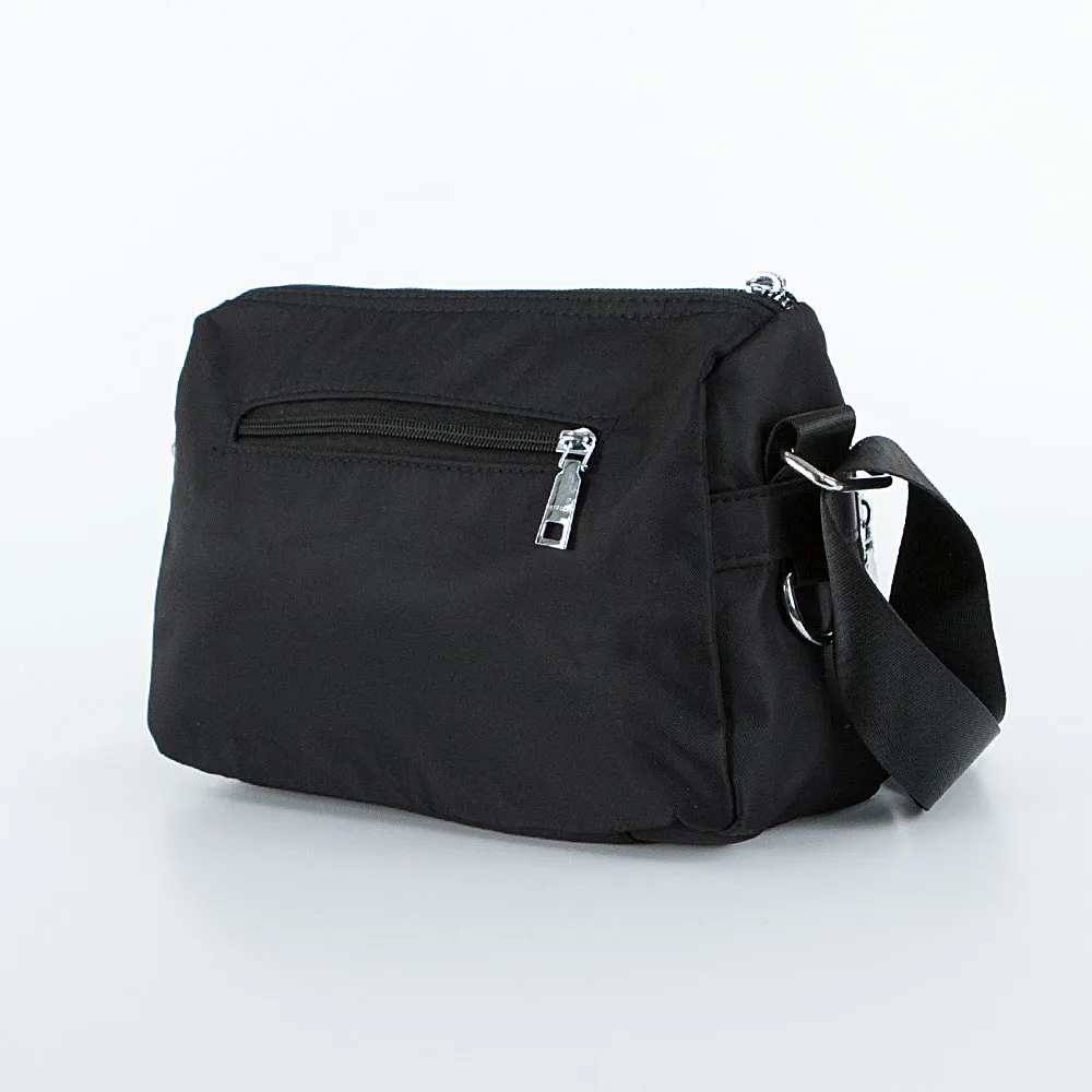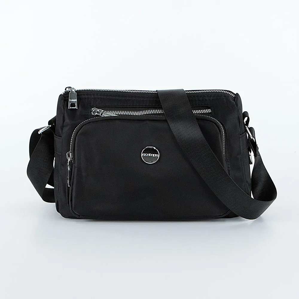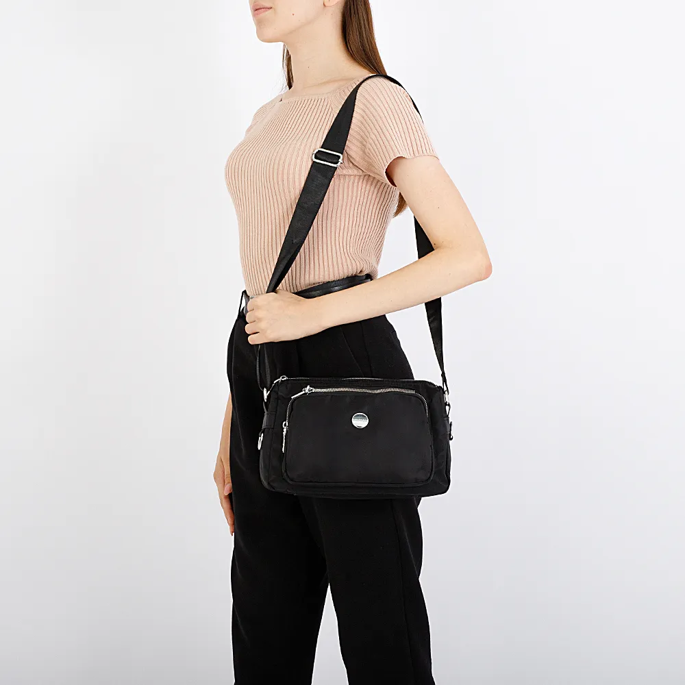Повседневная женская сумка Ecotope выполнена из текстильного материала чёрного цвета с металлической фурнитурой. Комфортно носится на регулируемом ремне через плечо. Застёгивается на молнию, внутри текстильная подкладка и три кармана. Снаружи три кармана на молниях.