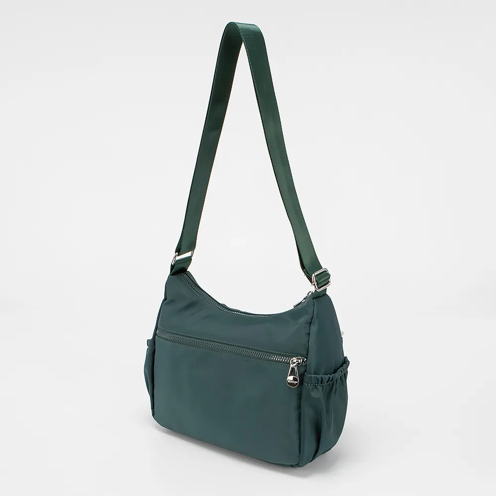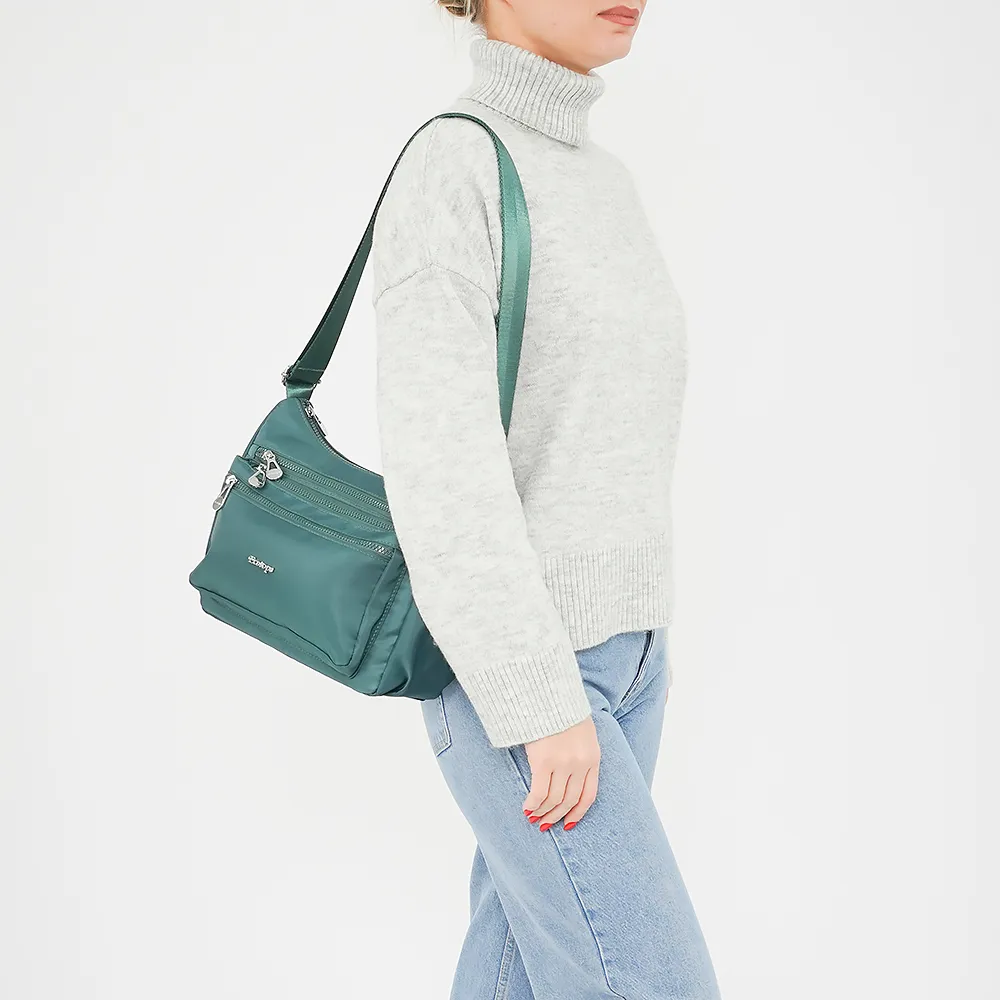 Сумка от торговой марки Ecotope из текстильного материала цвета морской волны. Модель с несъемным регулируемым плечевым ремнем. Отделение на молнии. Внутри: текстильная подкладка, карман на молнии. на лицевой стороне – три кармана на молнии. На задней стороне – карман на молнии. По бокам – накладной карман на резинке.