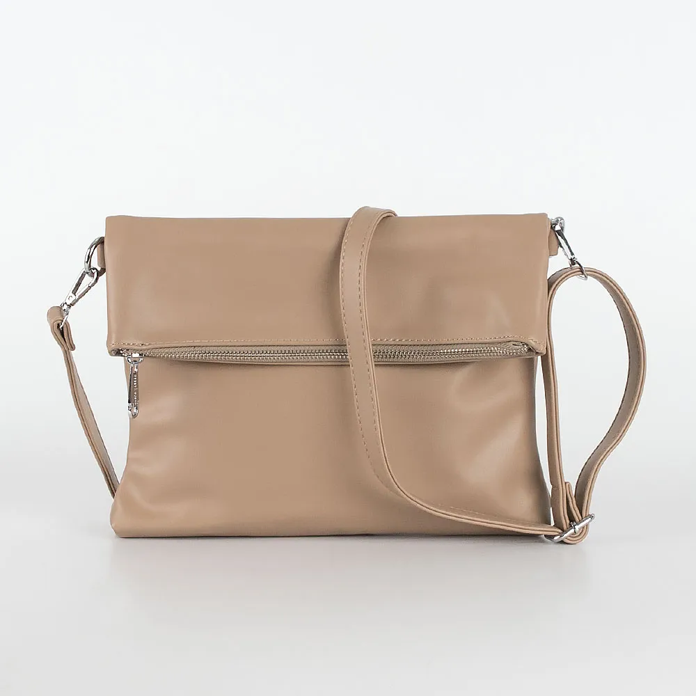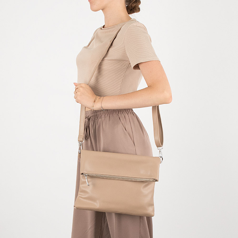 Сумка от торговой марки Passo Avanti из искусственной кожи кофейного цвета. Мягкая плоская модель фолдовер предназначена для использования в двух вариантах. В сложенном состоянии представляет собой модель-конверт; в развёрнутом получается достаточно вместительная сумка. Имеется съемная удлиненная ручка и съемный регулируемый плечевой ремень. Два отделения на молнии с текстильной подкладкой. В основном отделении – перегородка с карманом на молнии, карман на молнии и накладной карман. На задней стороне – карман на молнии.