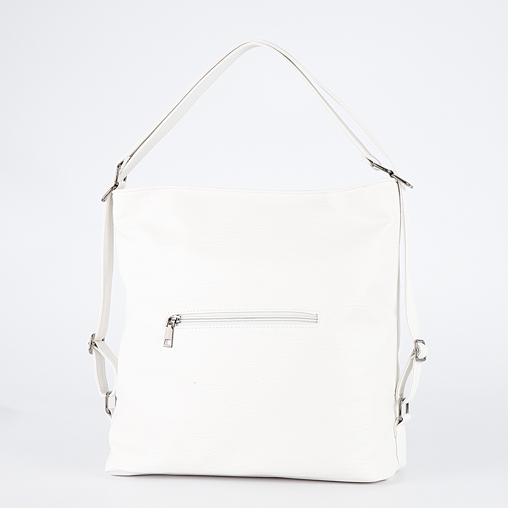 Сумка-рюкзак от торговой марки Passo Avanti из искусственной кожи белого цвета. Вместительная модель с двумя ручками, которые при стягивании превращаются в плечевые лямки. Отделение на молнии. Внутри: текстильная подкладка, средник и карман на молнии, два накладных кармана. На задней стороне – карман на молнии.