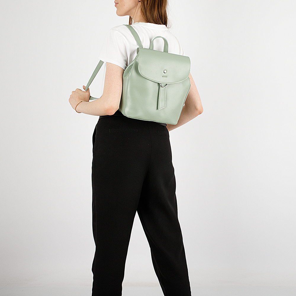Сумка-рюкзак от торговой марки Passo Avanti из искусственной кожи светло-зеленого цвета. Модель с лямкой-переноской и плечевыми лямками, которые при стягивании превращаются в плечевой ремень. Закрывается клапаном на магнитной кнопке. Сверху по бокам имеются кнопки, с помощью которых регулируется объем и форма рюкзака. Отделение на молнии. Внутри: текстильная подкладка, карман на молнии. На задней стороне – карман на молнии.