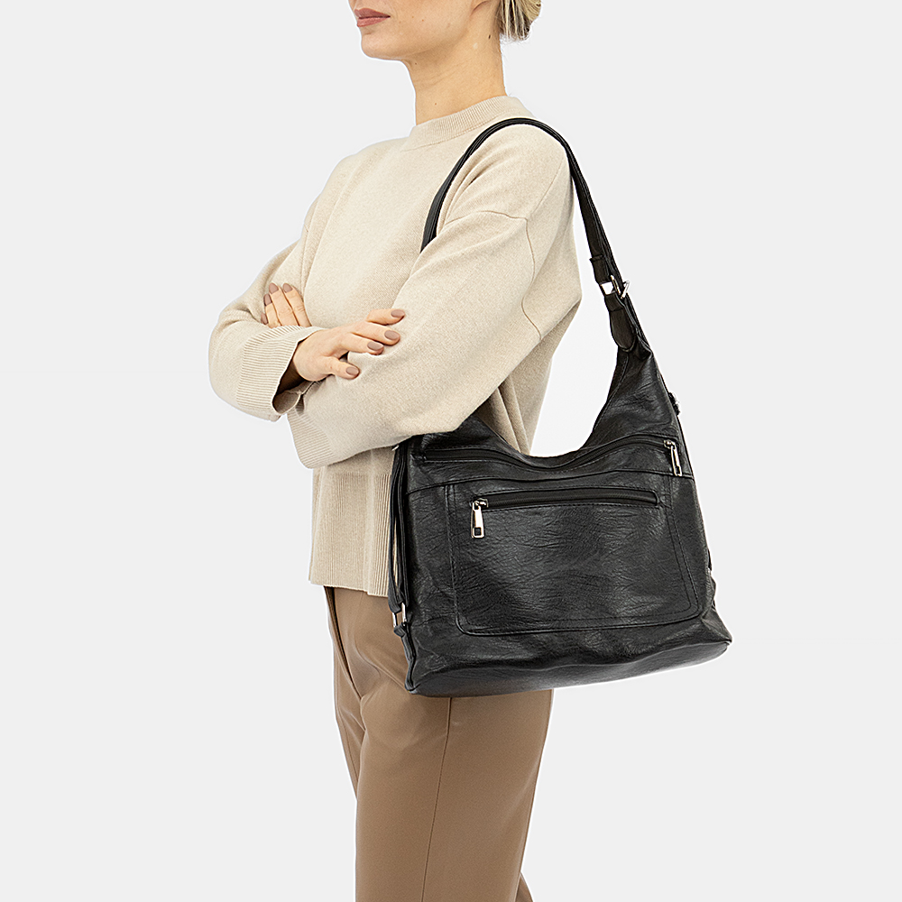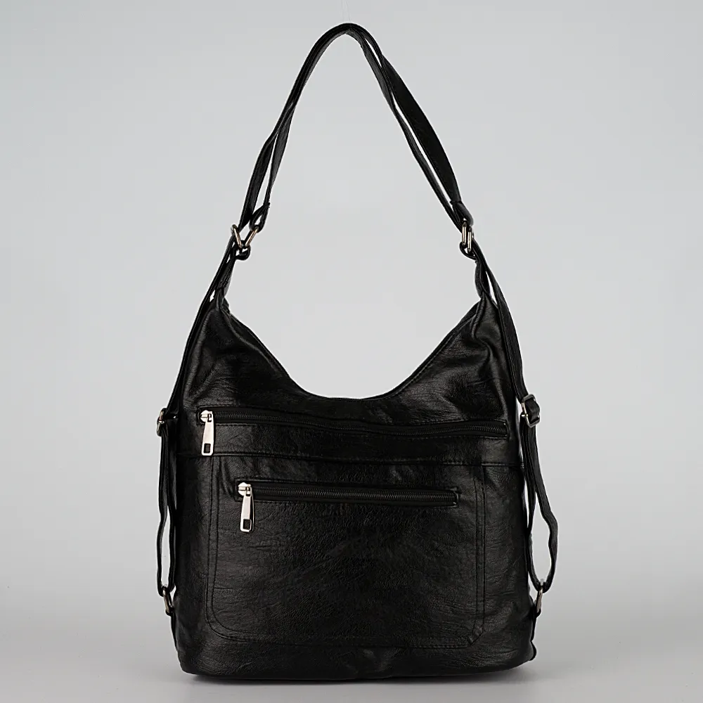 Сумка-рюкзак от торговой марки Passo Avanti из искусственной кожи черного цвета. Модель с двумя ручками, которые при стягивании превращаются в плечевые лямки. Отделение на молнии. Внутри: текстильная подкладка, средник и карман на молнии, два накладных кармана. На лицевой стороне – два кармана на молнии, на задней – карман на молнии.