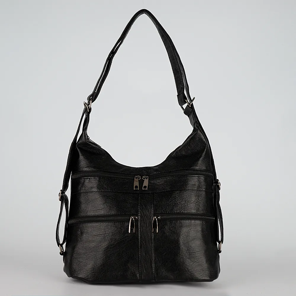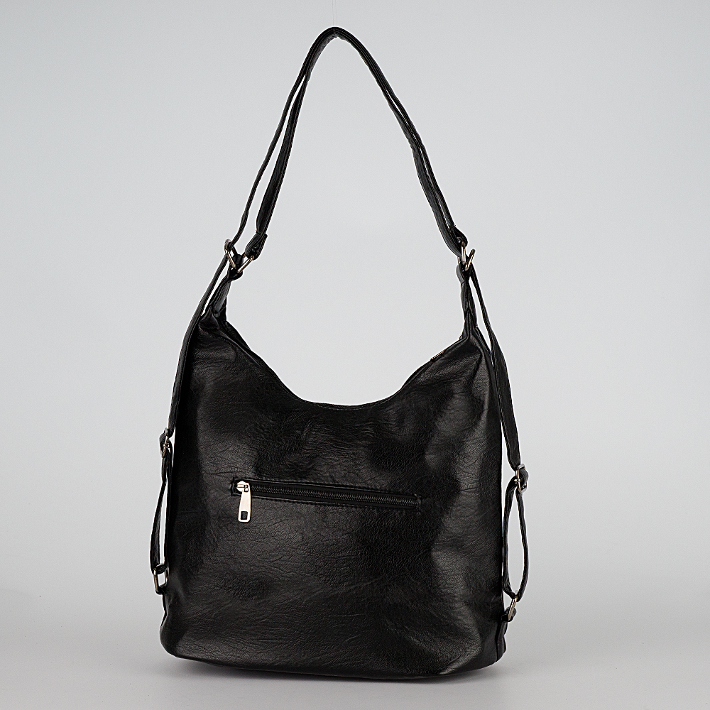 Сумка-рюкзак от торговой марки Passo Avanti из искусственной кожи черного цвета. Модель с двумя ручками, которые при стягивании превращаются в плечевые лямки. Отделение на молнии. Внутри: текстильная подкладка, средник и карман на молнии, два накладных кармана. На лицевой стороне – три кармана на молнии, на задней – карман на молнии.