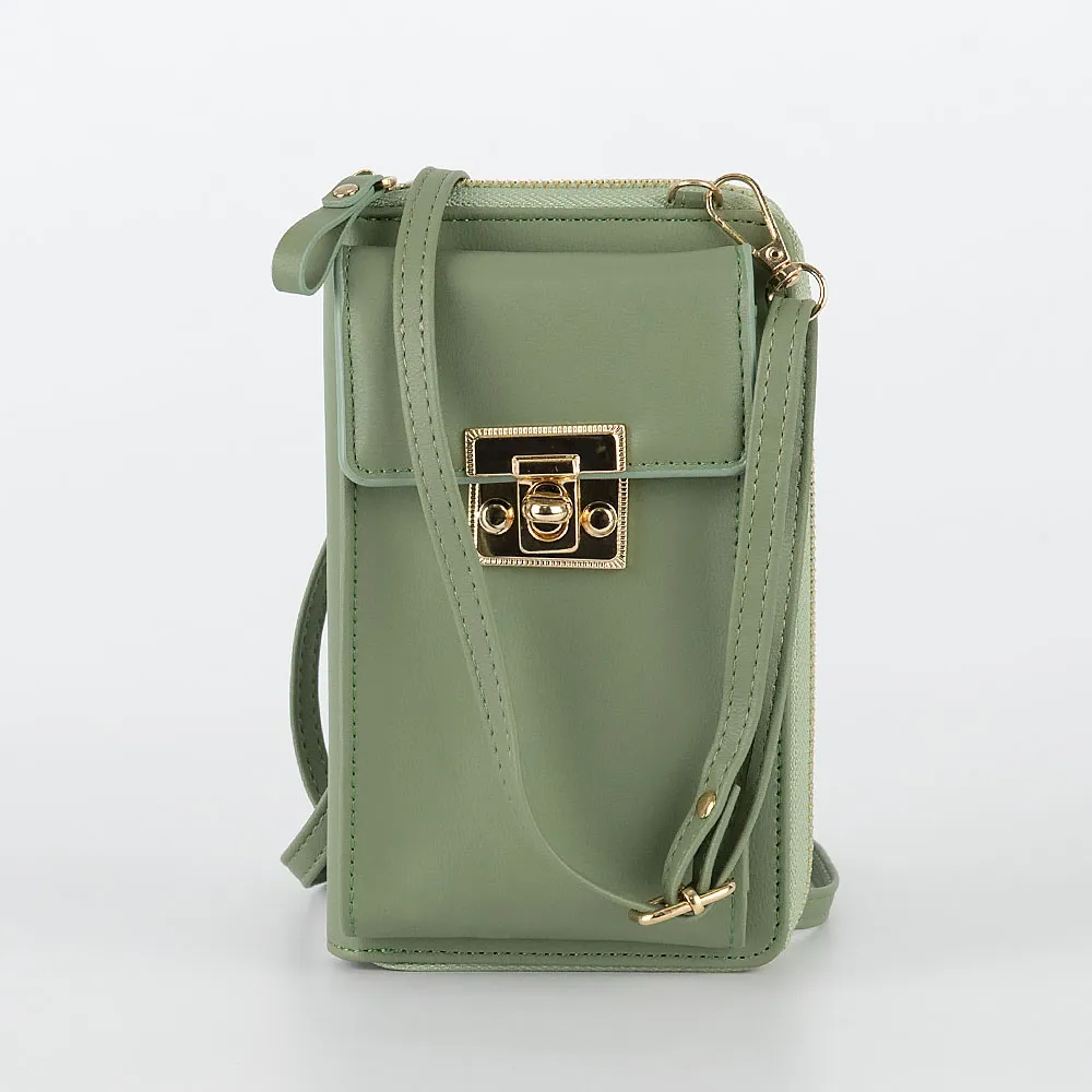 Сумка от торговой марки Passo Avanti из искусственной кожи светло-зеленого цвета. Компактная модель вертикальной ориентации со съемным регулируемым плечевым ремнем. Отделение на молнии с текстильной подкладкой. Внутри: средник с карманом на молнии, карманы для карт. На лицевой стороне – карман, закрывающийся клапаном на поворотном замке.
