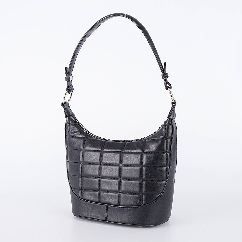 Сумка от торговой марки David Jones из искусственной кожи черного цвета. Декорирована мягкой прямоугольной стежкой. Модель с одной ручкой и съемным регулируемым плечевым ремнем. Отделение на молнии с длинным кожаным пуллером. Внутри: фирменная подкладка, карман на молнии, накладной карман. Овальное дно оснащено металлическими ножками для защиты от износа.