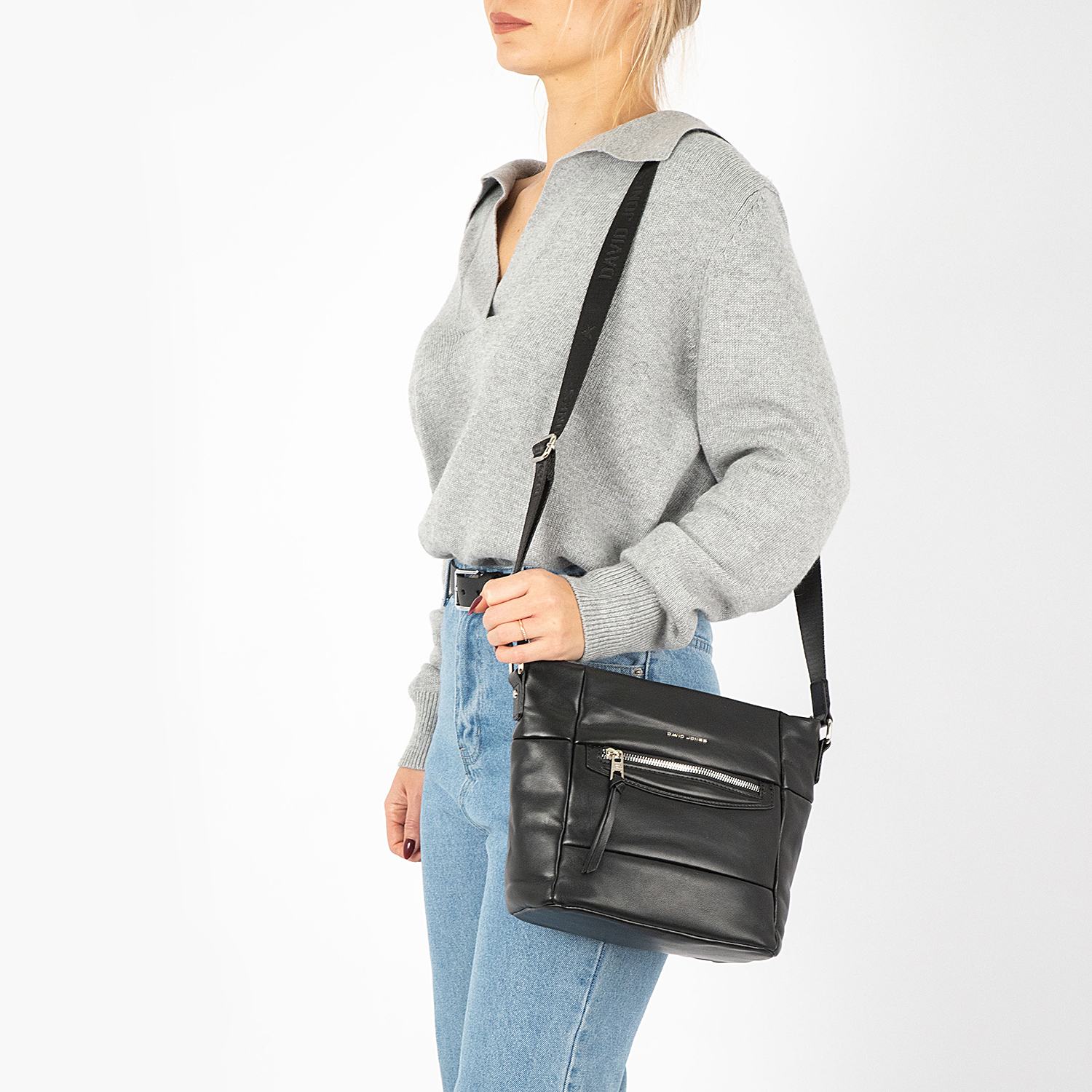 Сумка от торговой марки David Jones из экокожи черного цвета. Модель с несъемным регулируемым плечевым ремнем, выполненным из текстильного материала. Отделение на молнии. Внутри: фирменная подкладка, карман на молнии, накладной карман. На лицевой и задней сторонах – карман на молнии.