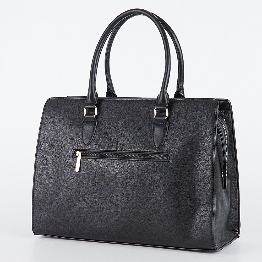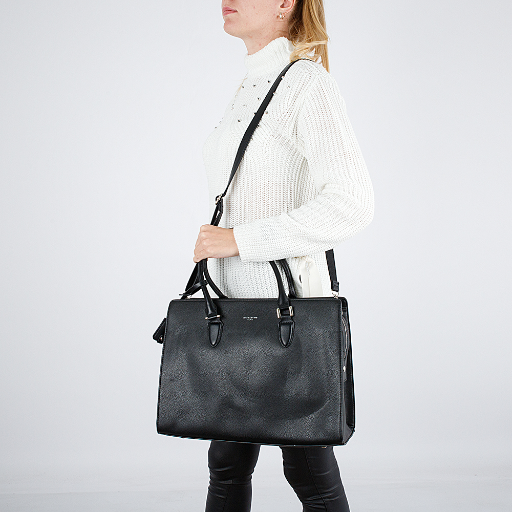 Сумка от торговой марки David Jones из искусственной кожи черного цвета. Большая вместительная модель в деловом стиле с двумя плотными ручками и съемным регулируемым плечевым ремнем. Отделение на молнии с двумя встречными бегунками; молния фиксируется по бокам магнитными кнопками. Внутри: фирменная подкладка, карман на молнии, два накладных кармана и перегородка с карманом на молнии, образующая накладной карман. Дно оснащено металлическими ножками для защиты от износа. Размер сумки подойдет для документов формата А4. Вес – 1,3 кг.