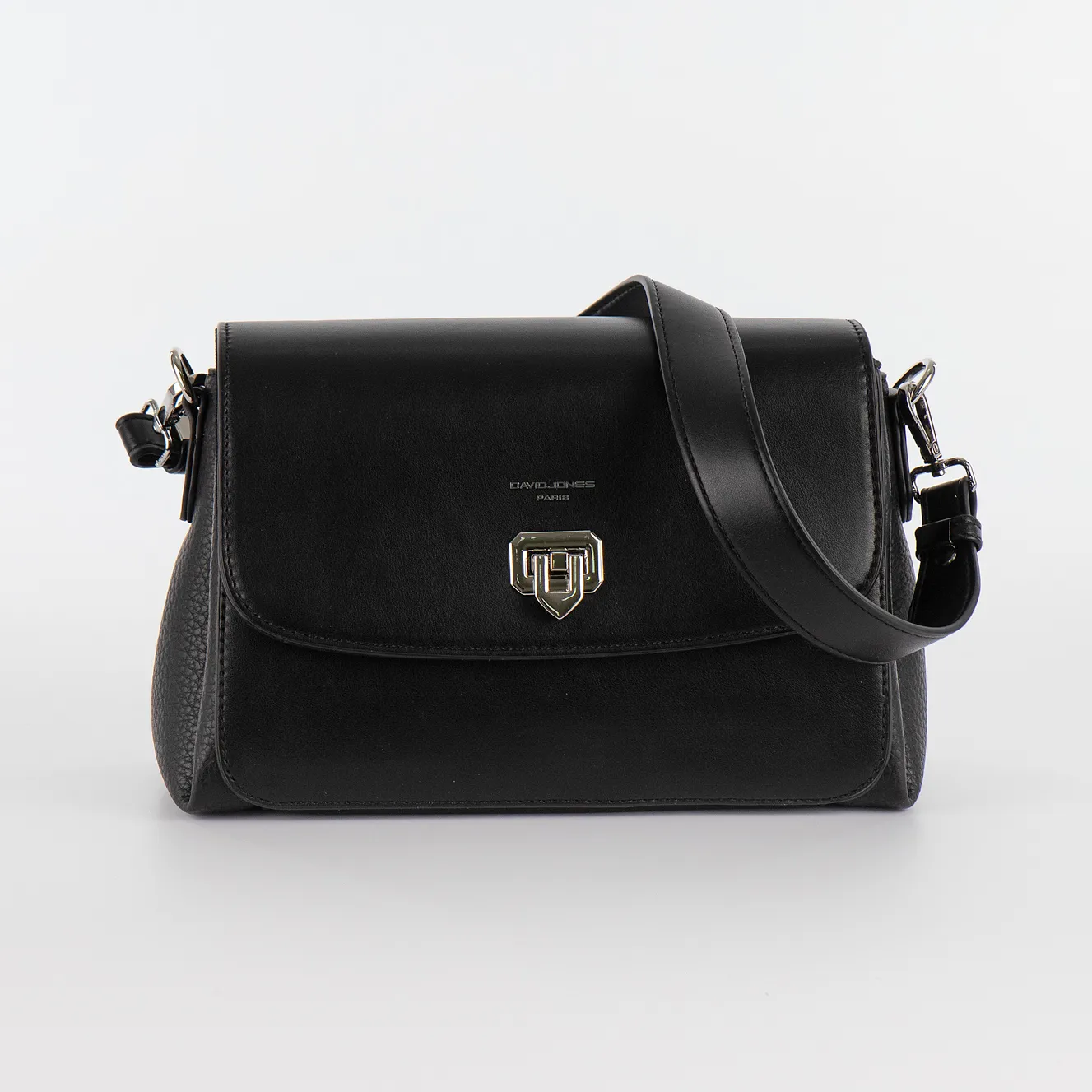 Сумка от торговой марки David Jones из искусственной кожи черного цвета. Модель со съемной ручкой и съемным регулируемым плечевым ремнем. Закрывается клапаном на поворотном замке. Внутри: три отделения с фирменной подкладкой. Среднее отделение на молнии; внутри: карман на молнии, накладной карман. На задней стороне – карман на молнии.