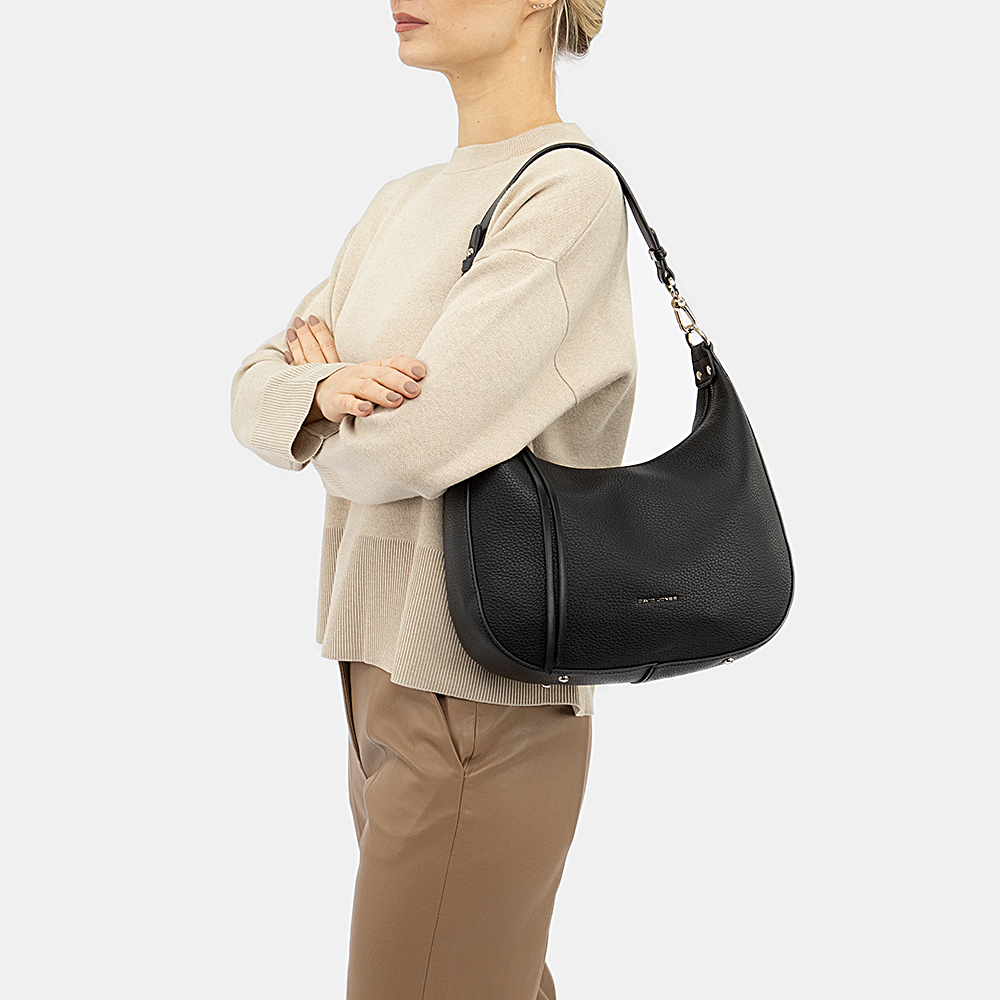 Сумка от торговой марки David Jones из искусственной зернистой кожи черного цвета. Модель среднего размера с одной съемной ручкой и съемным регулируемым плечевым ремнем. Отделение на молнии с длинным кожаным пуллером. Внутри: фирменная подкладка, карман на молнии, накладной карман. На задней стороне – карман на молнии.