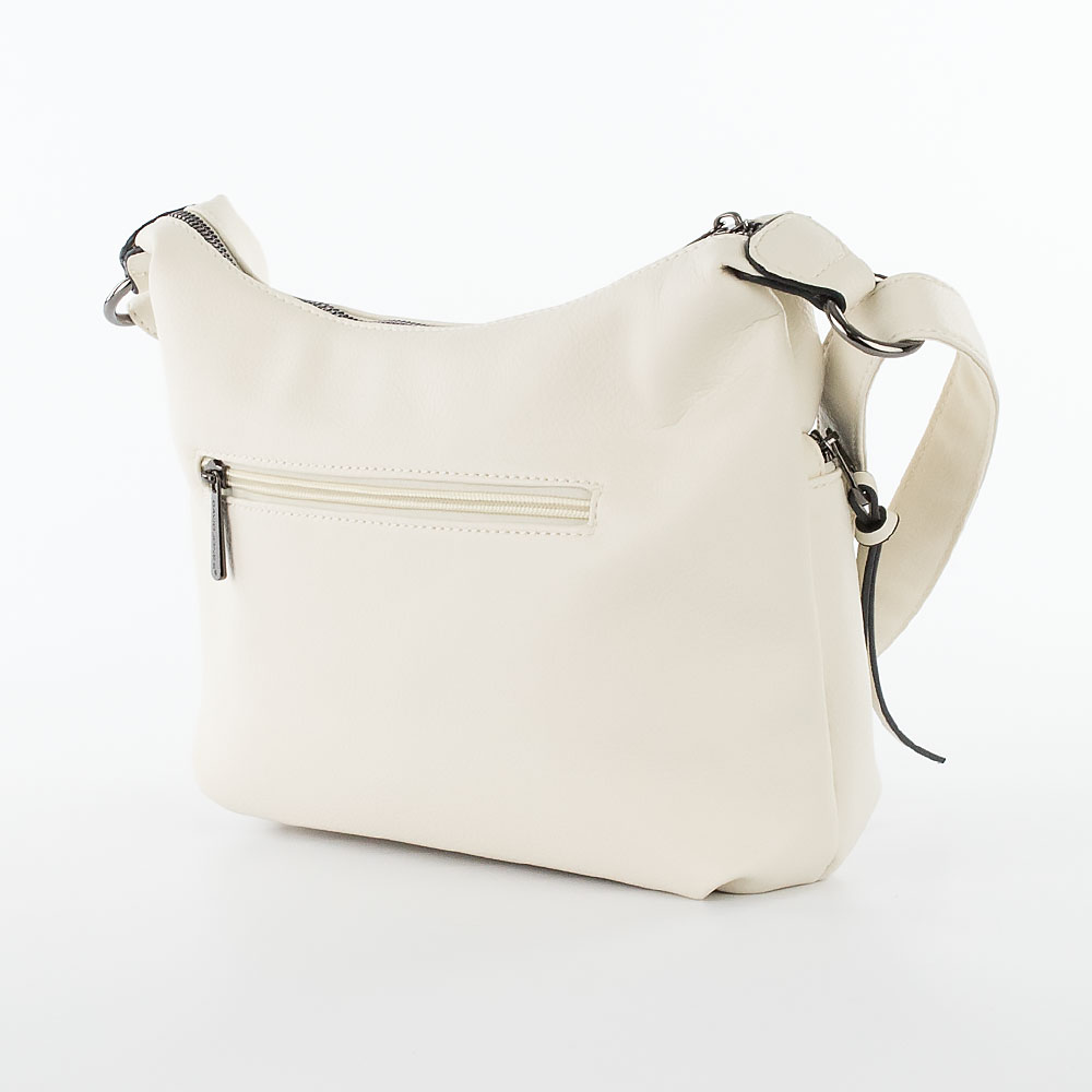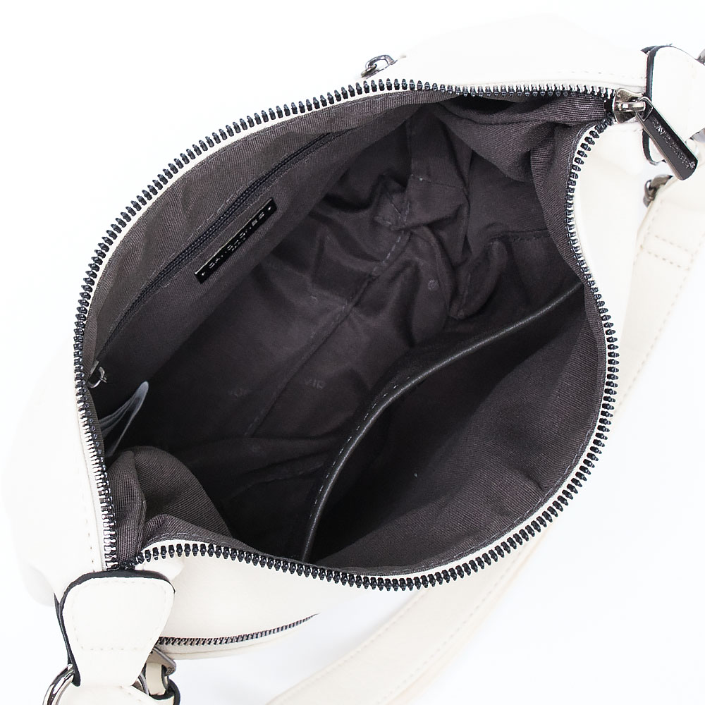 Сумка от торговой марки David Jones из искусственной кожи белого цвета. Модель с несъемным регулируемым плечевым ремнем. Отделение на молнии. Внутри: фирменная подкладка, карман на молнии, накладной карман. На лицевой стороне – два кармана на молнии с длинными кожаными пуллерами. На задней стороне – карман на молнии.