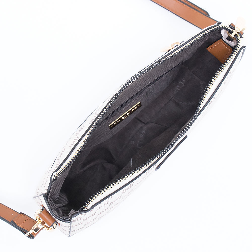 Сумка от торговой марки David Jones из искусственной кожи бежевого цвета. Декорирована оригинальным принтом с монограммой бренда. Модель со съемным регулируемым плечевым ремнем. Отделение на молнии. Внутри: фирменная подкладка, карман на молнии, накладной карман. На задней стороне – карман на молнии.